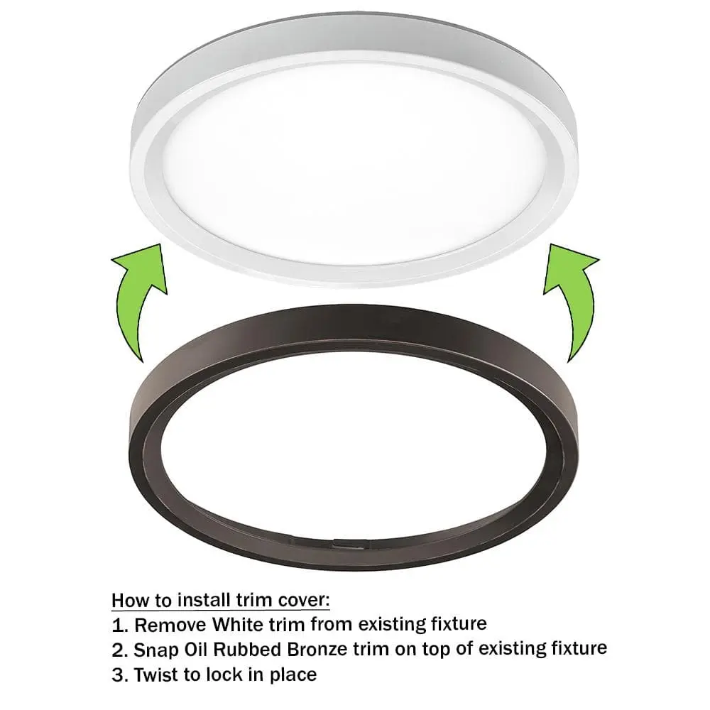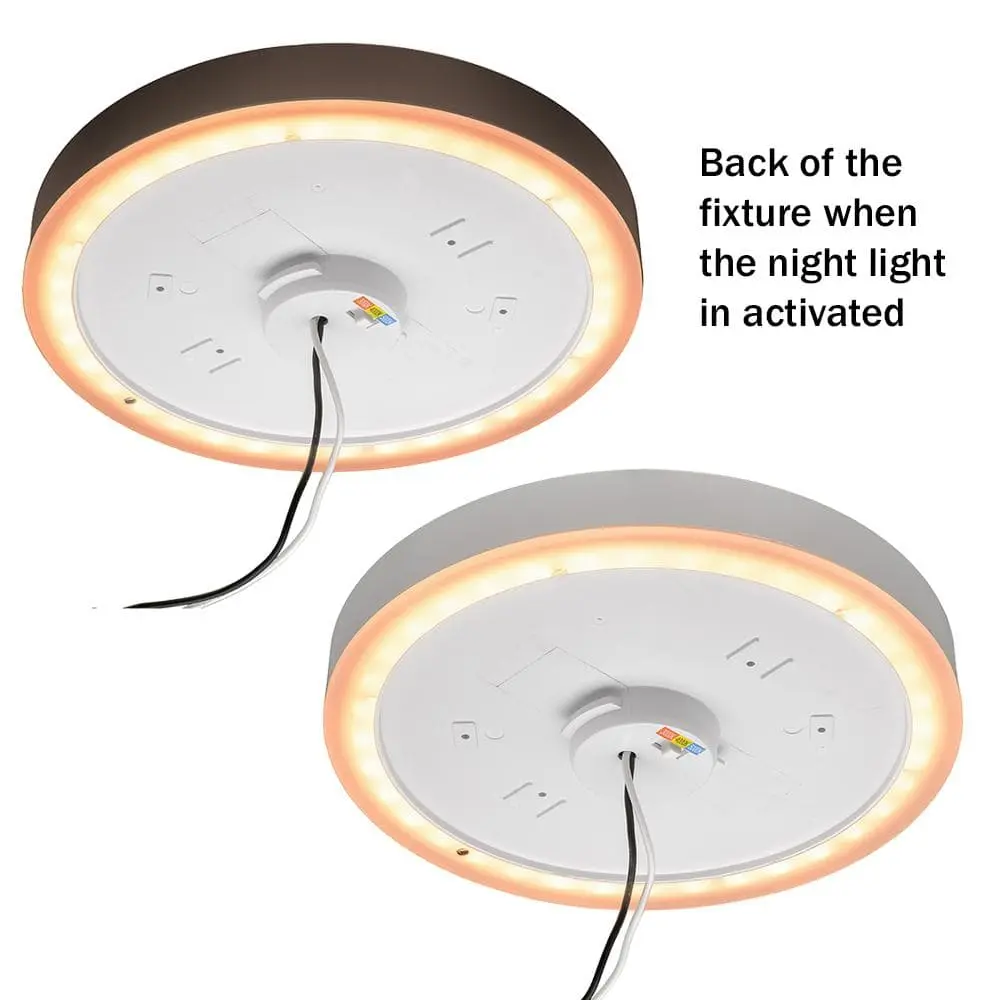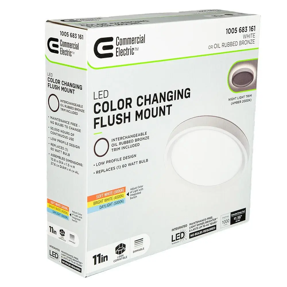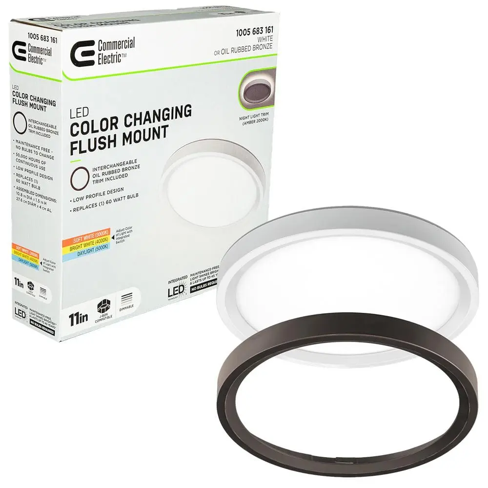 The Commercial Electric 11-inch Low Profile LED Flush Mount ceiling light offers an energy-efficient upgrade, replacing incandescent bulbs with integrated LED technology. It features a choice of white or Oil Rubbed Bronze trim, adjustable color temperature options (Soft White, Bright White, or Daylight), and a Night Light feature with a Soft Amber glow. Easy to install with the TwistFit system, it requires no maintenance or bulb replacements and lasts up to 50,000 hours. Perfect for various indoor spaces like kitchens, bathrooms, bedrooms, hallways, offices, and more.