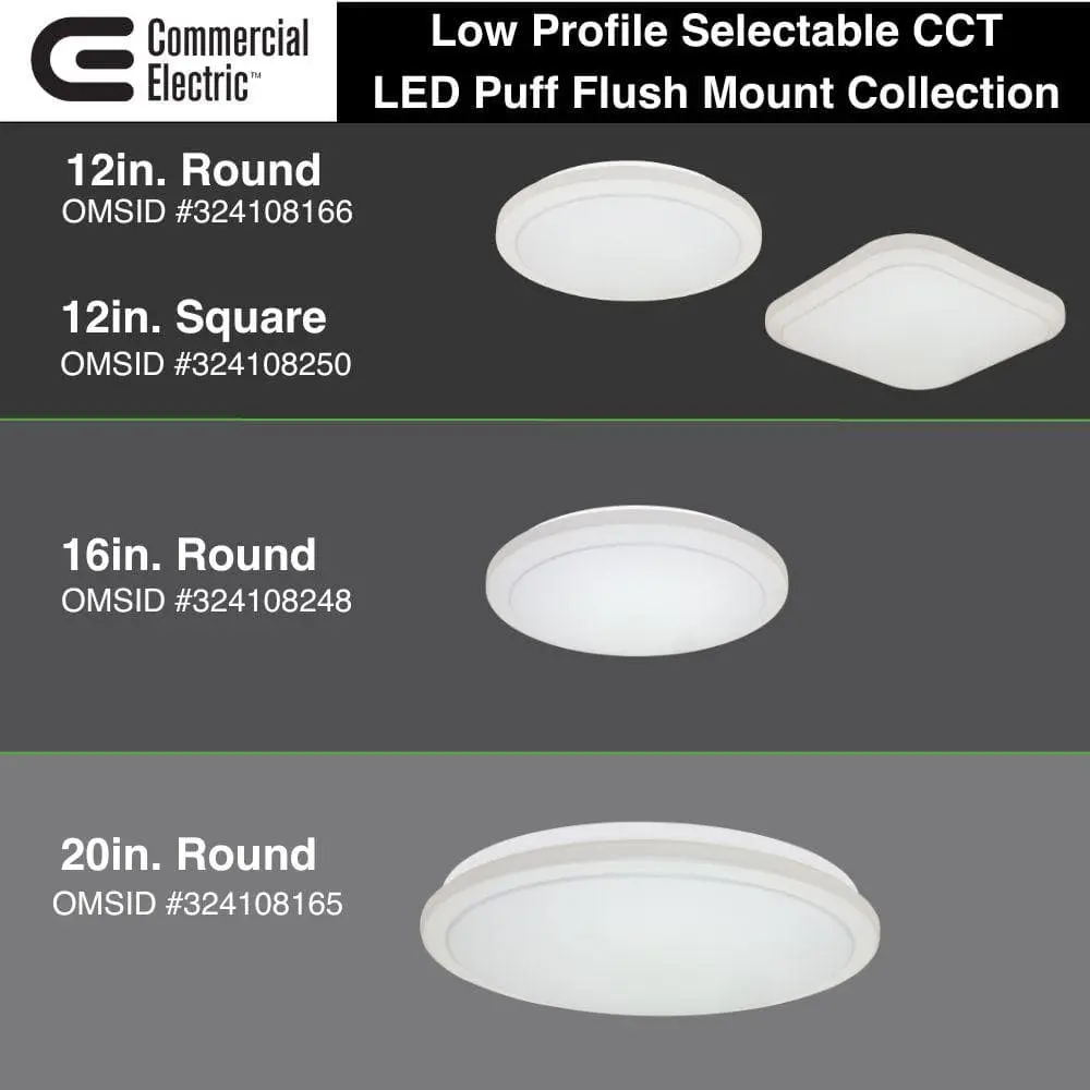 The Commercial Electric 12-inch White Round LED Flush Mount Ceiling Light is a stylish and energy-efficient alternative to traditional incandescent lighting. Its low-profile design makes it perfect for spaces with low ceilings, blending seamlessly with any ceiling aesthetic. You can easily adjust the color temperature to Soft White, Bright White, or Daylight to suit your preferences, and the light is dimmable for added flexibility. With 1100 Lumens of brightness and a smooth frosted lens, it provides even, clear light with no discoloration or dark spots over time. This maintenance-free fixture features an integrated LED light engine, eliminating the need for bulb replacements. Ideal for use in kitchens, bathrooms, offices, hallways, and more, it offers reliable lighting for various settings.