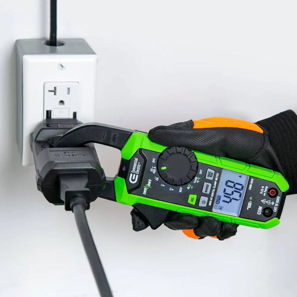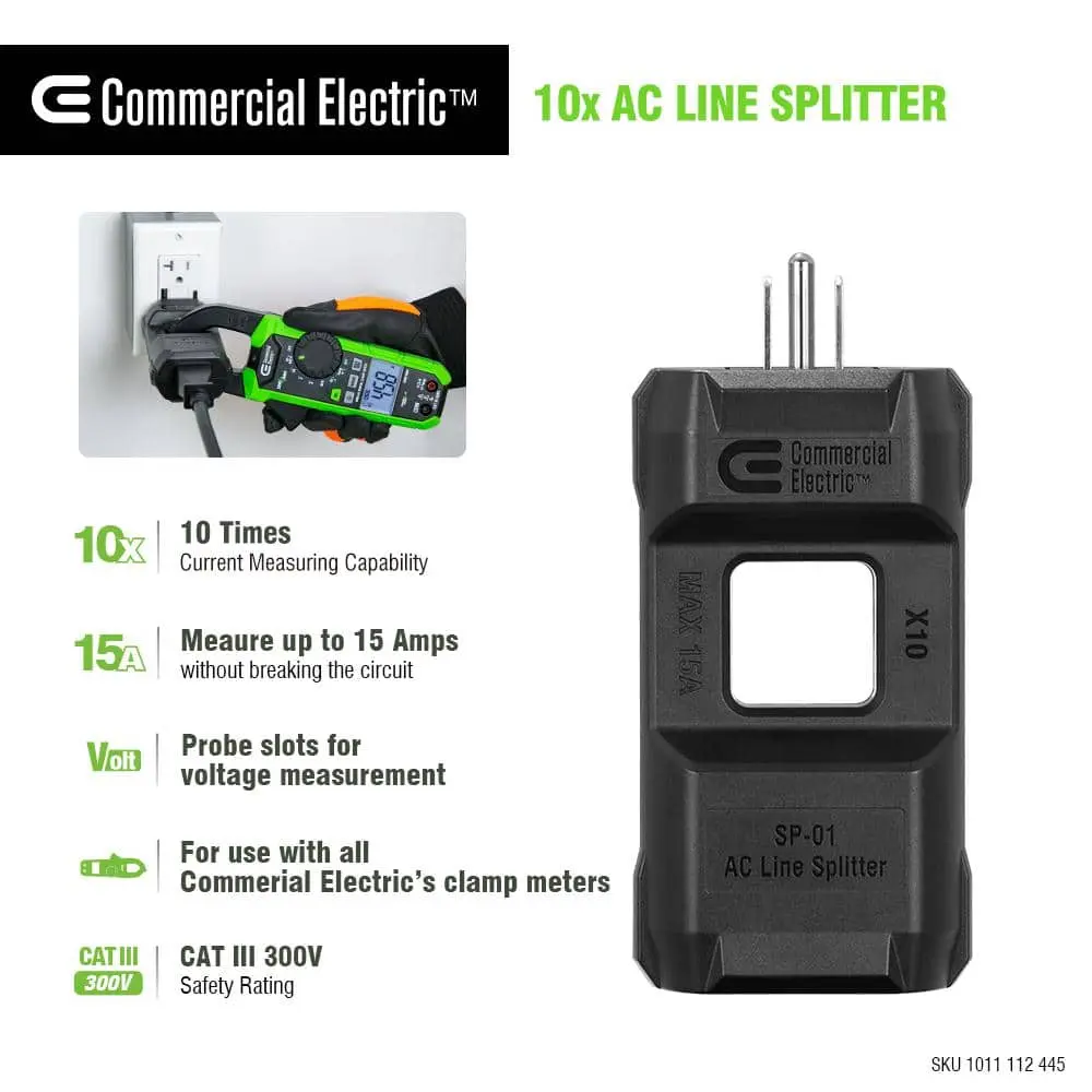 The Commercial Electric 120-Volt 10x AC Line Splitter (SP-01) allows for precise current measurements by separating hot, neutral, and ground wires on standard 120-Volt outlets. This ensures that the current clamp accurately measures load current without interference. The line splitter includes both a standard measurement section and a ten-times multiplier section, making it compatible with higher-range or less-accurate clamp meters. While designed for use with Commercial Electric clamp meters, it is also compatible with most other clamp meter brands, offering broad functionality.