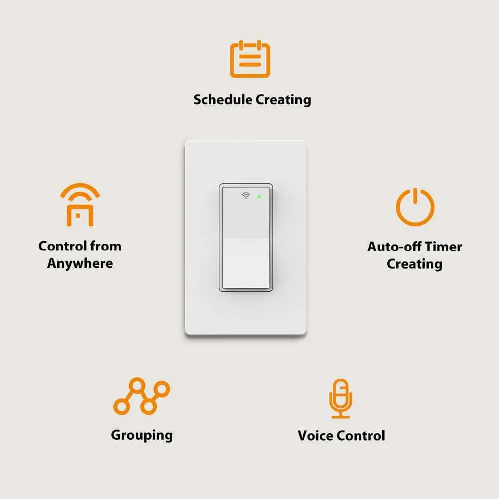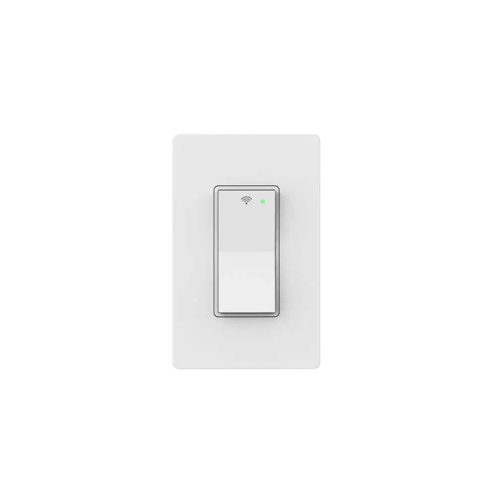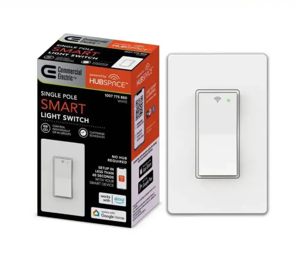 The Commercial Electric Smart Hubspace 15 Amp Single-Pole Specialty Light Switch with Wi-Fi and Bluetooth Technology enables you to control your lighting remotely using the Hubspace app, available for Android and iPhone. No hub is needed, and it is compatible with Amazon Alexa and Google Assistant, allowing voice control for turning lights on or off. You can easily set schedules through the app to automate lighting. Installation is simple, as the smart switch functions like a traditional light switch and is designed for single-pole setups. It requires a neutral wire for operation.