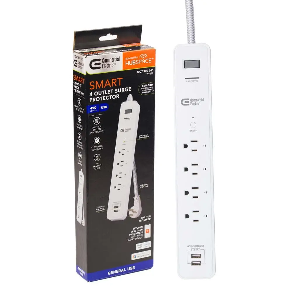 This smart power strip lets you control up to 6 appliances at once, featuring 4 independently controlled outlets and 2 always-on USB ports, perfect for charging devices at home or in the office. It’s compatible with Alexa and Google Assistant, allowing you to use voice commands to manage plugged-in devices. You can also create schedules and timers to turn individual outlets on or off at specific times, helping you save energy and reduce your power bill. Simply download the Hubspace app, plug in your smart power strip, connect it to Wi-Fi, and begin controlling your devices.