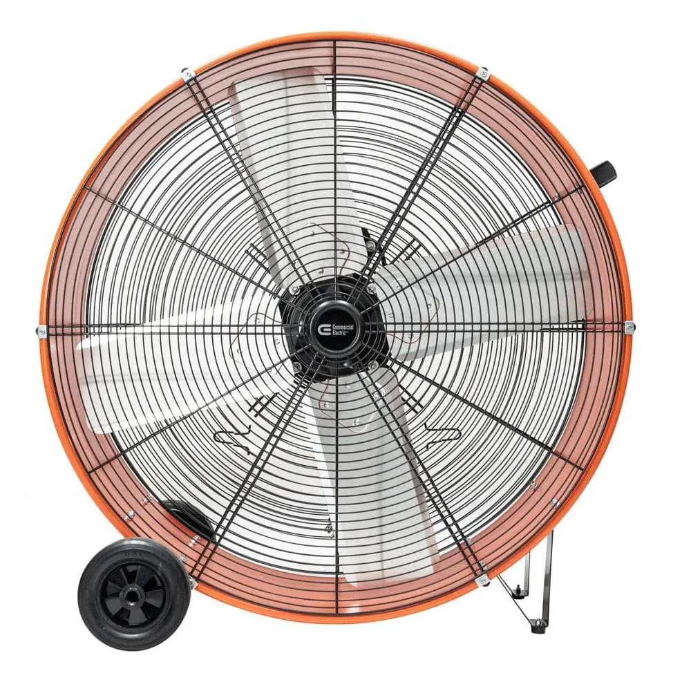 The Commercial Electric 30-inch drum fan is designed for indoor industrial and commercial use, making it perfect for environments like factories, garages, basements, and warehouses, where both people and machines need to be kept cool. Powered by a high-velocity motor with 2-speed settings, this fan allows you to adjust air output to suit your needs. Built with durable steel housing and rust-resistant grills, it’s made to last. The fan also features 2 wheels and a sturdy handle for easy positioning and transport, along with a cord wrap for convenient storage.