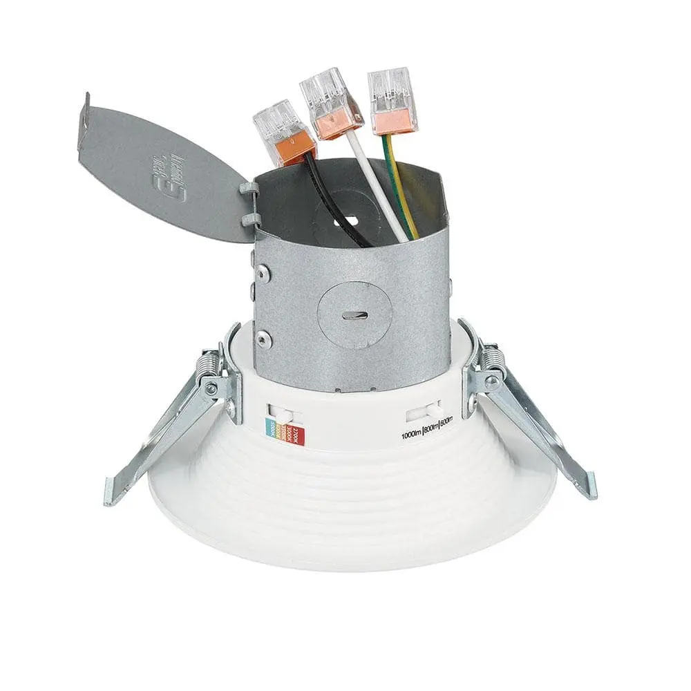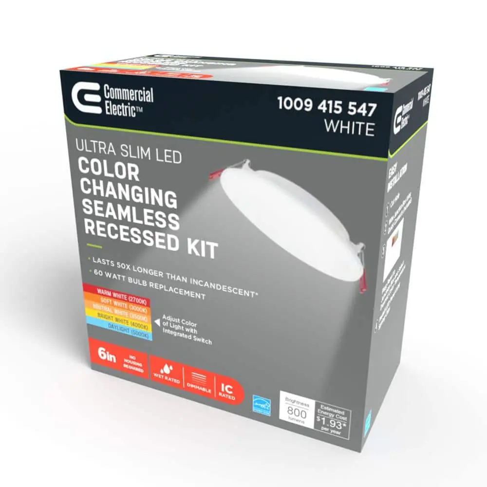 Commercial Electric 4 in. Easy Up In-Ceiling Fixtures are LED-powered recessed downlights with a built-in junction box for direct wiring—no need for separate housings. Simply wire a 120-Volt connection directly from the ceiling to the fixture's junction box. The spring-loaded clips secure the light to the ceiling drywall. Featuring 5 selectable CCT settings (2700K, 3000K, 3500K, 4000K, 5000K) and 3 lumen settings (600, 800, or 1000), these lights offer flexibility for any indoor space. Pre-installation configuration is easy with manual switches. Ideal for both residential and commercial ceilings, these lights work for new construction and remodels. Wet location rated and compatible with ceilings with or without insulation, they are also dimmable (10% to 100%) with most LED-rated dimmers. Save up to 80% on energy costs compared to incandescent bulbs, and the airtight design helps reduce heating and cooling losses.
