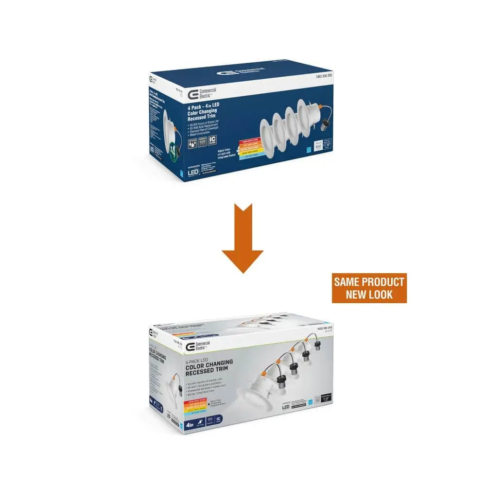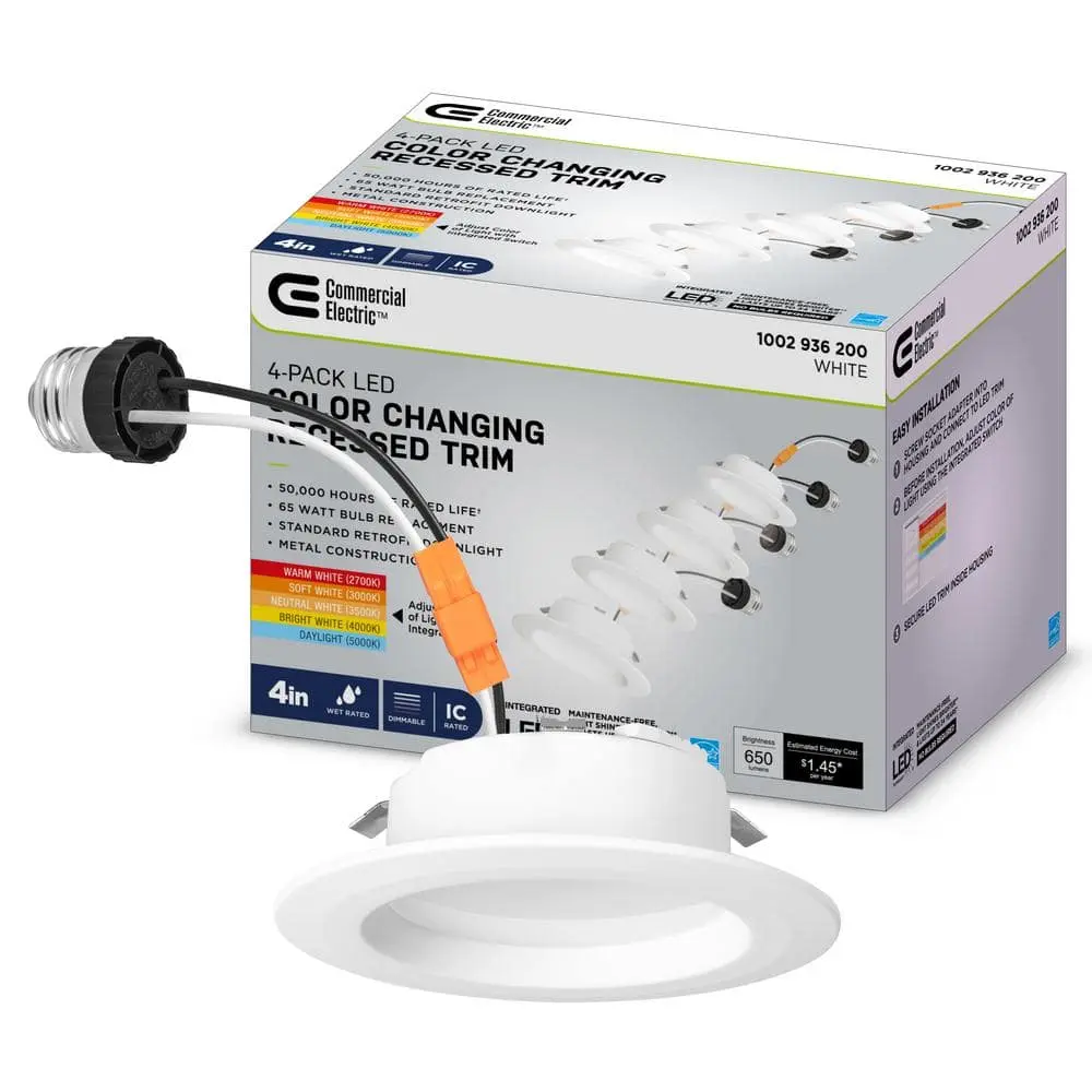 The Commercial Electric 4 in. Color Temperature Select LED downlight is an excellent way to upgrade your existing can lights to sleek, energy-efficient recessed lighting. This LED downlight features a unique color temperature selection, allowing you to choose from five different settings (2700K to 5000K) with the flip of a switch located on the back. Whether you prefer soft, warm lighting for relaxation or bright daylight for task lighting, you can easily adjust to suit your needs. Using just 8.5 watts of energy, it provides brightness comparable to a 65-watt incandescent bulb, with an estimated annual energy cost of only $1.36. The downlight is built to last, with a lifespan of 50,000 hours, equivalent to approximately 34 years of use—50 times longer than a traditional incandescent bulb. It is compatible with most 4 in. recessed housings and comes with a medium (E26) socket base adapter for easy installation. Additionally, the downlight works seamlessly with most dimmer switches, allowing you to adjust the lighting to create the perfect ambiance for any space while saving on energy costs.