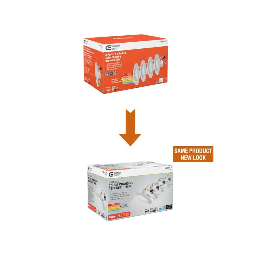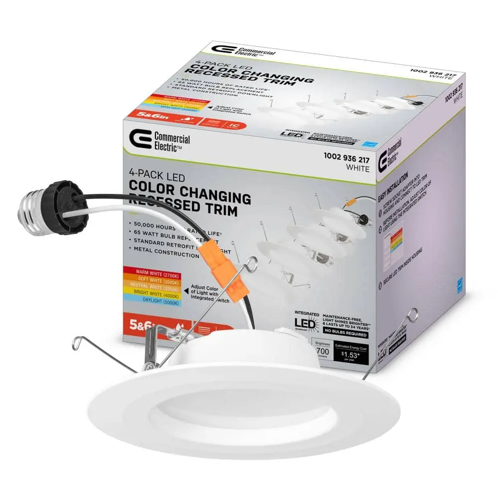 The Commercial Electric 5/6 in. Color Temperature Select LED downlight offers an easy upgrade for your existing can lights, combining sleek recessed lighting with energy-efficient LED technology. These downlights feature a color temperature (CCT) changing switch, allowing you to select your preferred light warmth, from Warm White (2700K) to Daylight (5000K), with options in between (3000K, 3500K, and 4000K). Using only 9 watts, they provide brightness equivalent to a 65-watt incandescent bulb and cost approximately $1.44 per year to operate. With a 50,000-hour lifespan (about 34 years), they last 50 times longer than traditional incandescent bulbs. Compatible with most 5-inch and 6-inch housings, these downlights are easy to install with a medium (E26) socket base adapter.