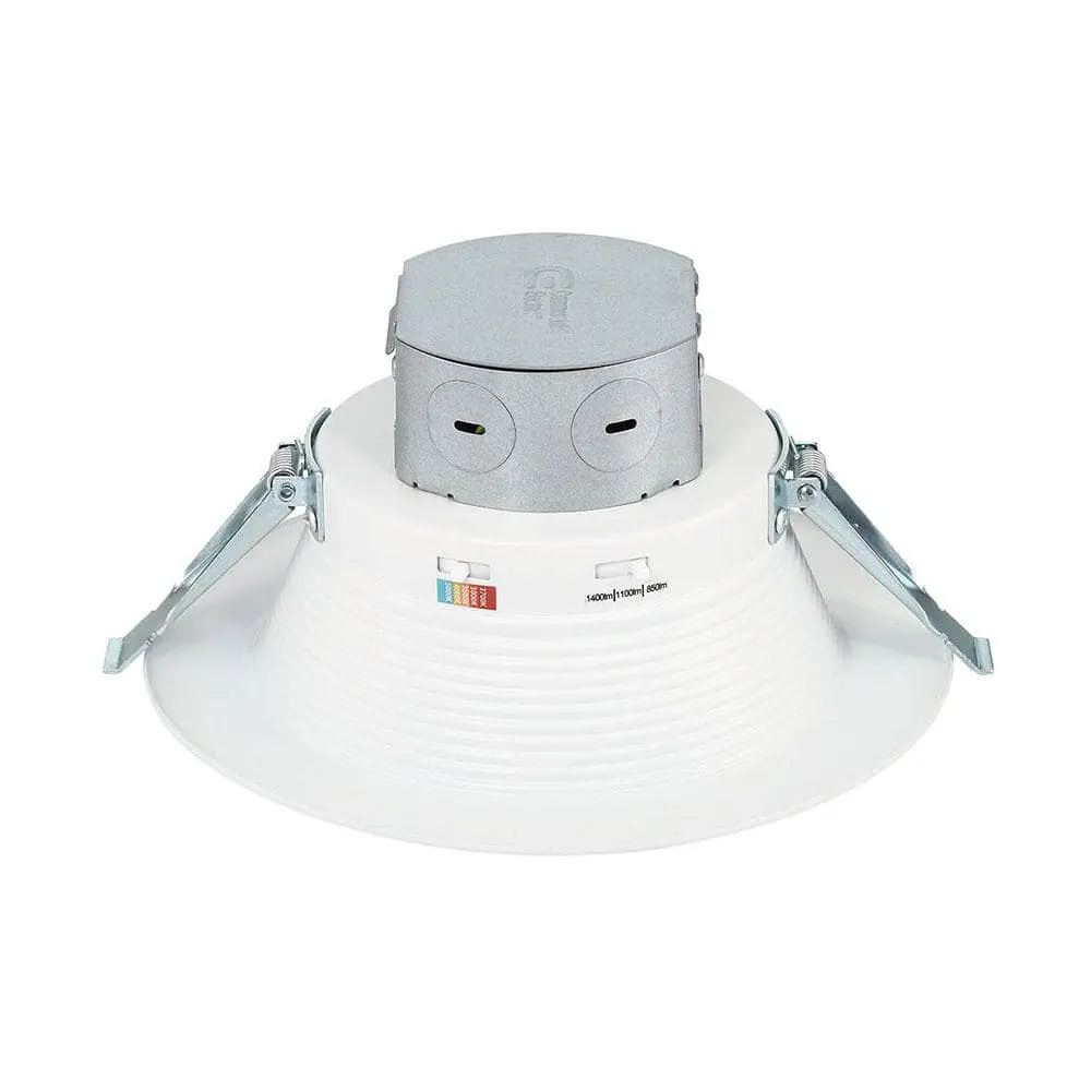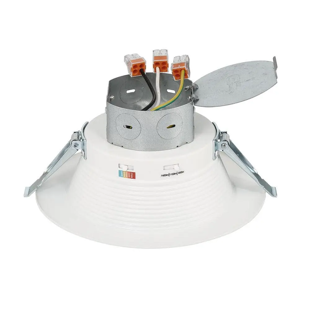 Commercial Electric’s 6 in. Easy Up LED recessed downlights feature a built-in junction box for easy direct wiring, eliminating the need for additional housings. With 5 selectable CCT options (2700K to 5000K) and 3 lumen settings (850, 1100, or 1400), these lights can be easily configured before installation. Ideal for residential and commercial use, they are wet location rated, suitable for ceilings with or without insulation, and compatible with most LED dimmers. These energy-efficient lights save up to 80% over incandescent bulbs and prevent heating and cooling losses with their airtight design.