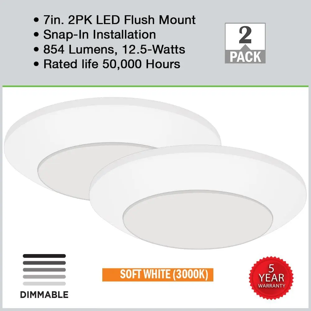 The Commercial Electric 7-inch White LED Flush Mount Ceiling Light is a compact yet powerful lighting solution. Emitting 854 lumens of soft white (3000K) illumination while using only 12.5 watts, it replaces outdated 75-watt incandescent bulbs, offering energy savings and long-lasting performance. Made of durable metal, this fixture is maintenance-free, requiring no bulb replacements. Ideal for residential spaces such as closets, pantries, utility rooms, stairwells, attics, basements, laundry rooms, and storage areas.