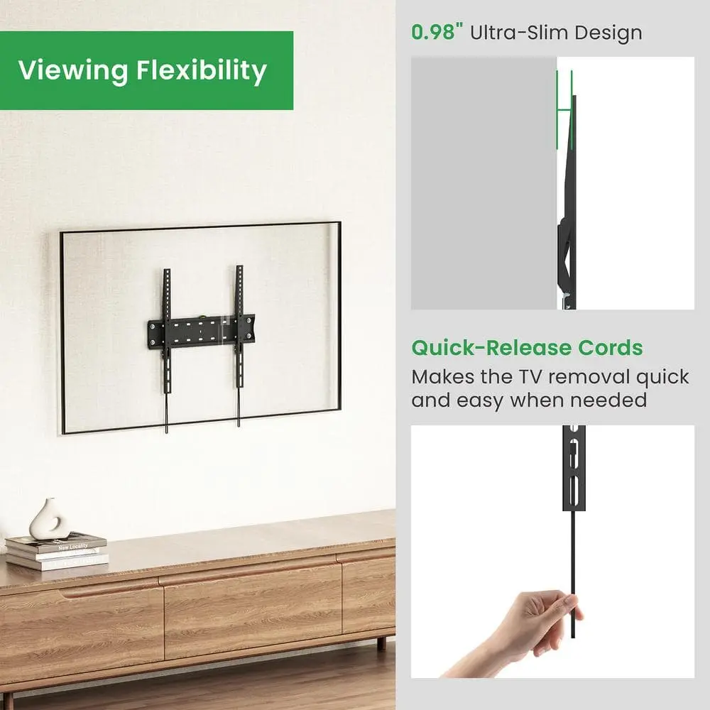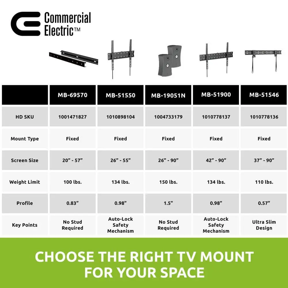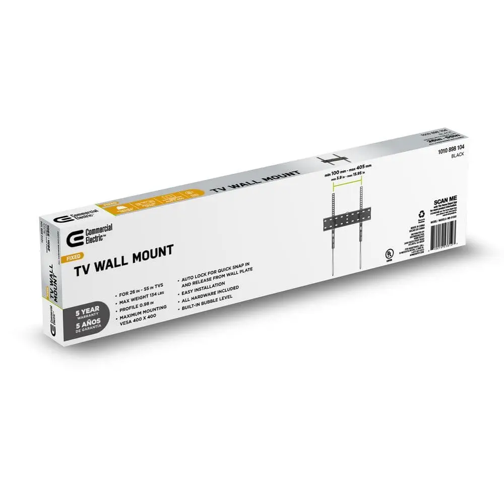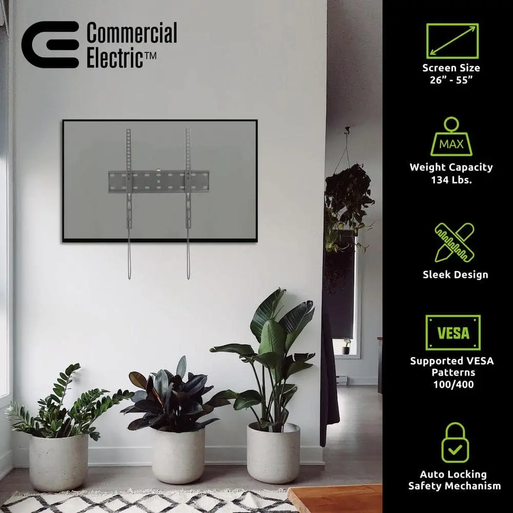 Easily mount your TV with the Commercial Electric Fixed TV Wall Mount. Designed for flat panel screens from 26 to 55 inches and weighing up to 134 pounds, this mount installs effortlessly on sheetrock, wood, metal studs, brick, or concrete walls using the included hardware. With a low-profile design, your TV sits just 0.98 inches from the wall, creating a clean, modern look ideal for bedrooms, living rooms, or home offices. Built from durable aluminum and tested to support up to 134 pounds, this mount ensures the safety of your electronics. An auto-lock mechanism adds extra peace of mind. With included hardware and a built-in level, installation is quick and hassle-free. Enjoy long-lasting performance with this dependable TV mount.