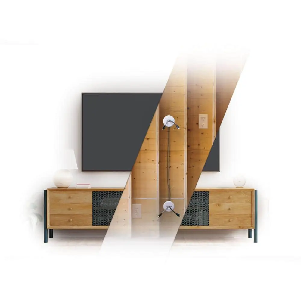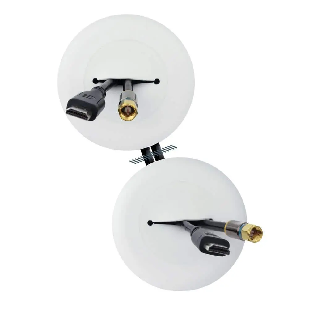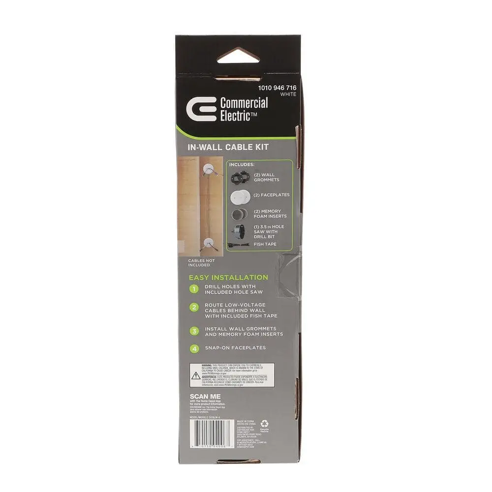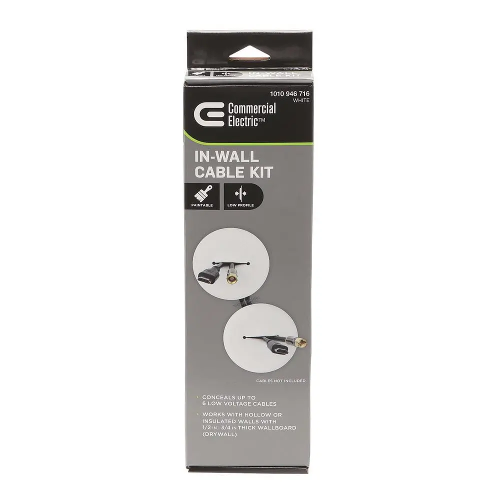The Commercial Electric In-Wall Cable Kit allows you to discreetly conceal low-voltage cables and cords inside the wall, keeping your space clean and organized. Perfect for mounted TVs, this kit eliminates the mess of visible cables by hiding them behind the wall. The included wall plates cover access points and can be painted or wallpapered to blend seamlessly with your decor. This kit is designed for use with any wall-mounted device that has an existing power source. Note: This kit is not intended for power cables.