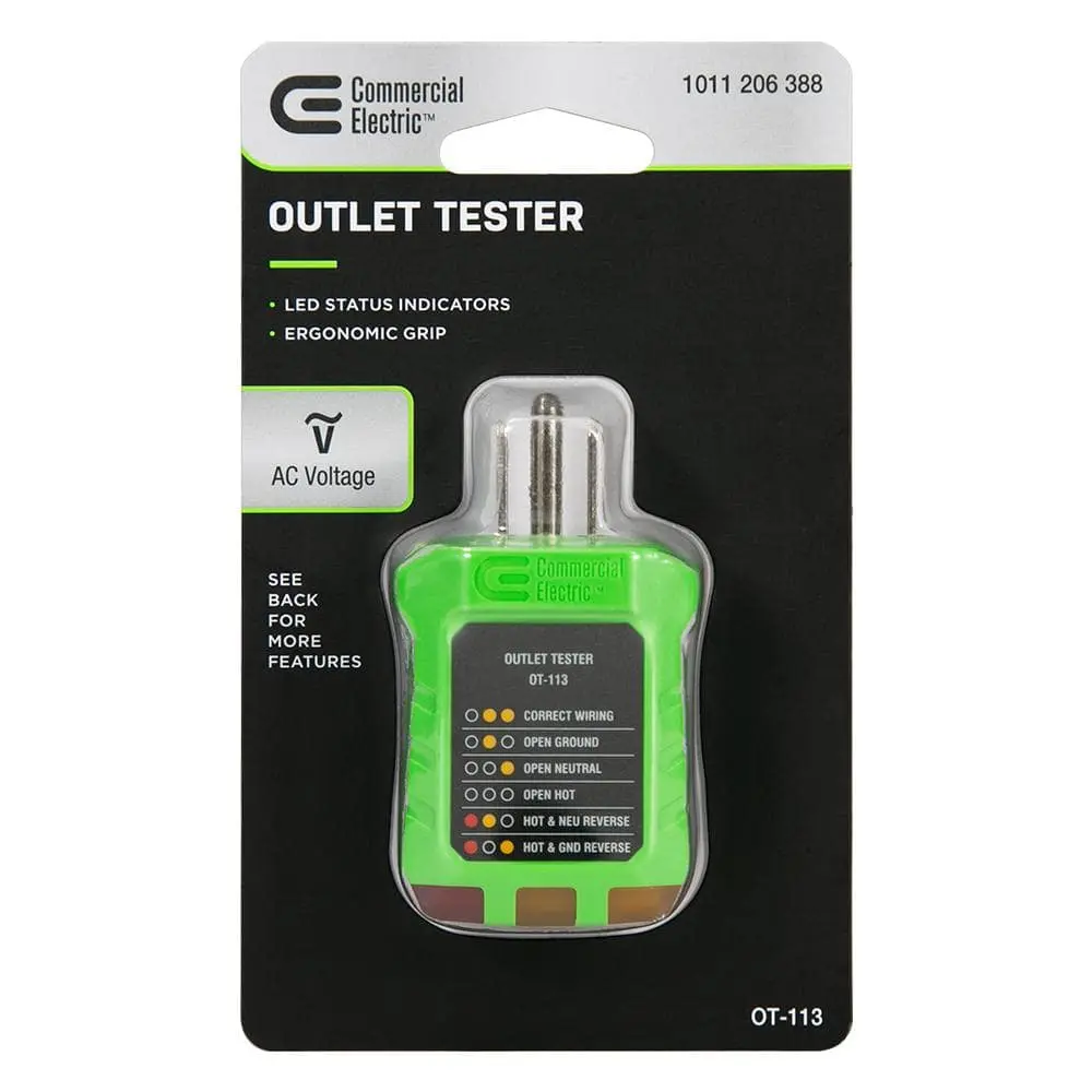 The Commercial Electric Outlet Tester (OT-113) provides a reliable and safe solution for detecting common wiring issues in standard 3-wire receptacles. It identifies issues such as open ground, open neutral, open hot, hot-to-ground reverse, hot-to-neutral reverse, and correct wiring. The tester uses a light sequence to show the wiring condition, simplifying the process of diagnosing and resolving electrical problems.