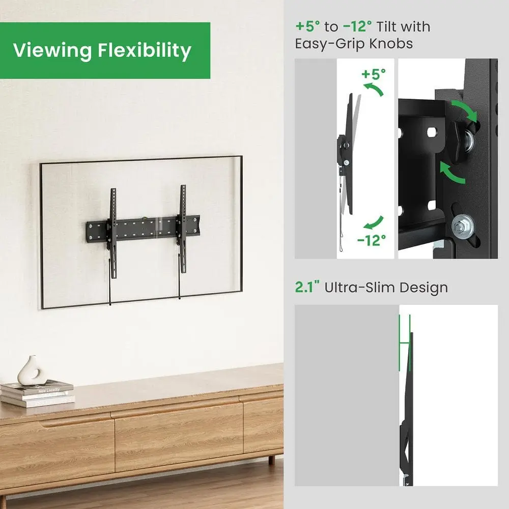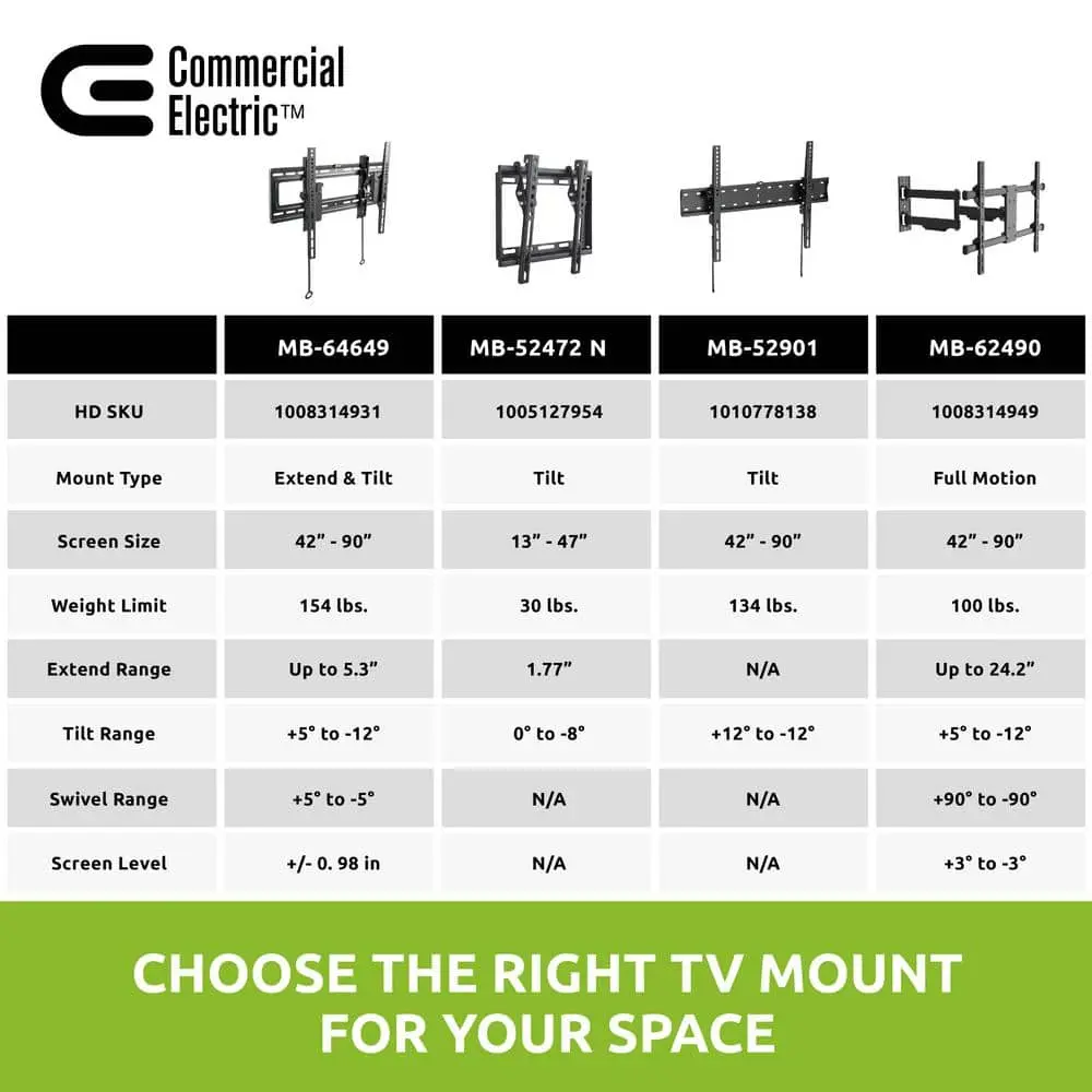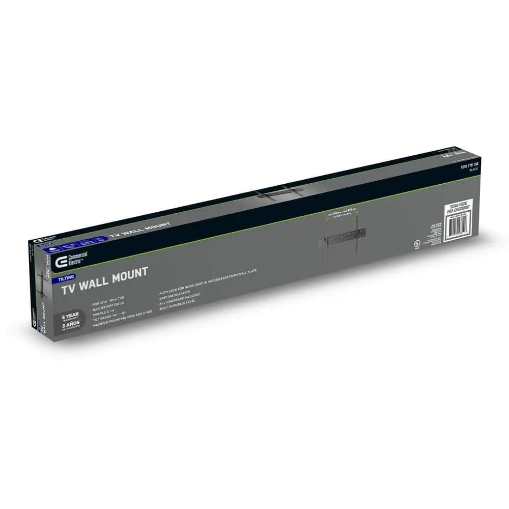 Enhance your viewing experience with the Commercial Electric Tilt TV Wall Mount, designed to support large flat-screen TVs from 42 inches to 90 inches, weighing up to 134 lbs. This durable mount offers excellent stability and flexibility, providing optimal viewing angles with a tilt range from +12° to -12°, reducing glare and minimizing eye strain. With a full motion mount for precise screen positioning, you can customize your TV's angle for the perfect view. Installation is simple with the included hardware, built-in level, and secure auto-lock mechanism. This mount is compatible with VESA standards from 200x200 mm to 600x400 mm, fitting a wide variety of TV models.