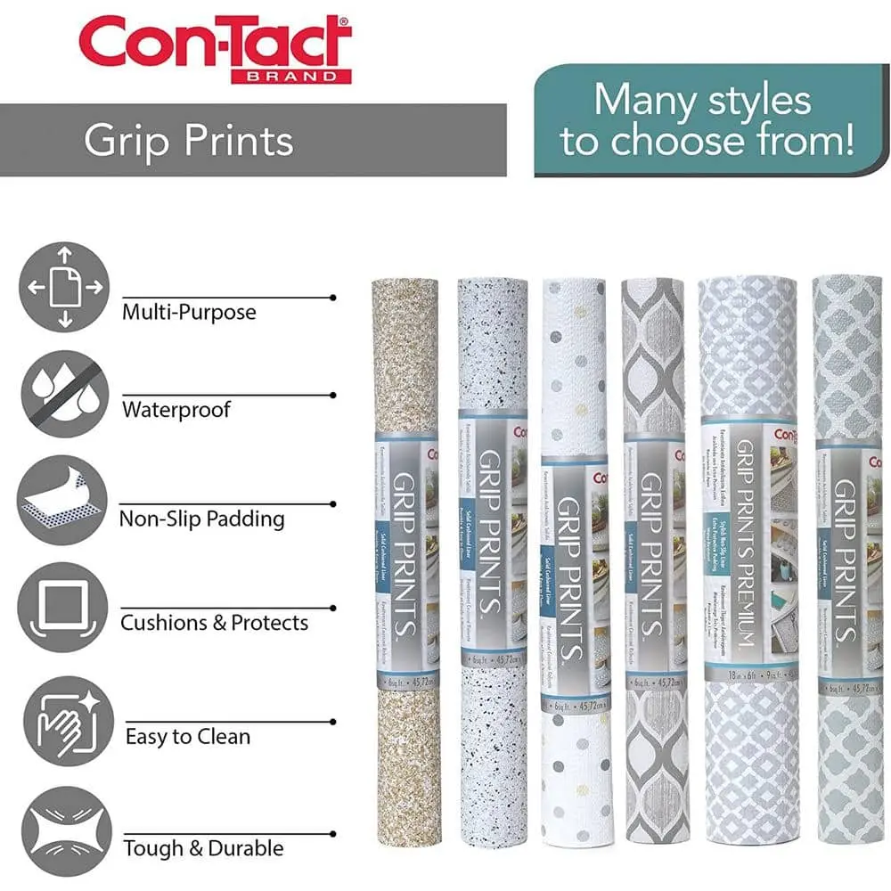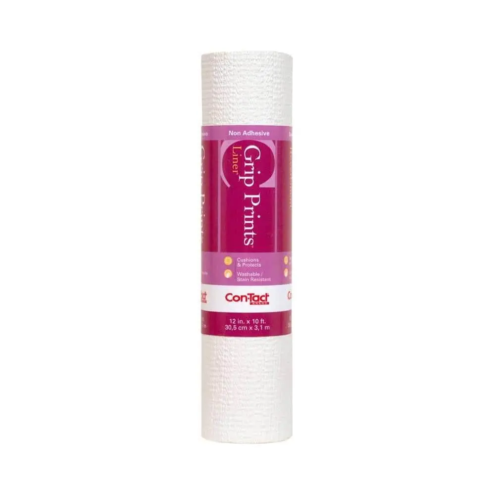 Add style and protection to your storage spaces with the Con-Tact Grip Prints White Shelf/Drawer Liner. Featuring a stylish white print design, this liner enhances the look of any shelf or drawer. Its non-adhesive grip backing keeps it securely in place without slipping, while the cushioned surface helps prevent scratches and damage. Made from durable and washable material, it's easy to clean and reuse. Plus, it’s easy to cut and customize, making it perfect for a variety of uses in shelves, drawers, and cabinets
