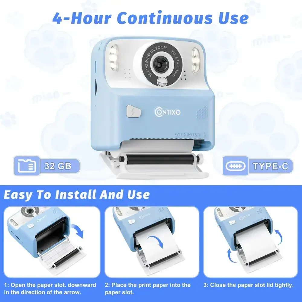 The Contixo KC2 Instant Film Camera is the perfect birthday gift for kids, providing a fun and engaging way to capture precious moments. This 12MP camera, designed for children as young as three, goes beyond being just a toy—it's a creative tool for learning and exploration. With features like 16x digital zoom, 1080P video quality, and instant photo printing, kids can take high-quality pictures with ease. The camera includes 3 rolls of printing paper, ensuring hours of entertainment, and even has an MP3 player for listening to favorite tunes while capturing memories. The 2.4-inch high-definition IPS screen, dual front and rear cameras, auto-focus, puzzle games, fill light, and timed shooting features offer a full range of functions for young photographers. It charges efficiently with a DC-5/1A voltage and supports up to a 32GB microSD card. Available in blue and pink, the KC2 bundle also includes a lanyard, charging cable, and user manual, making it the ultimate package for budding photographers.