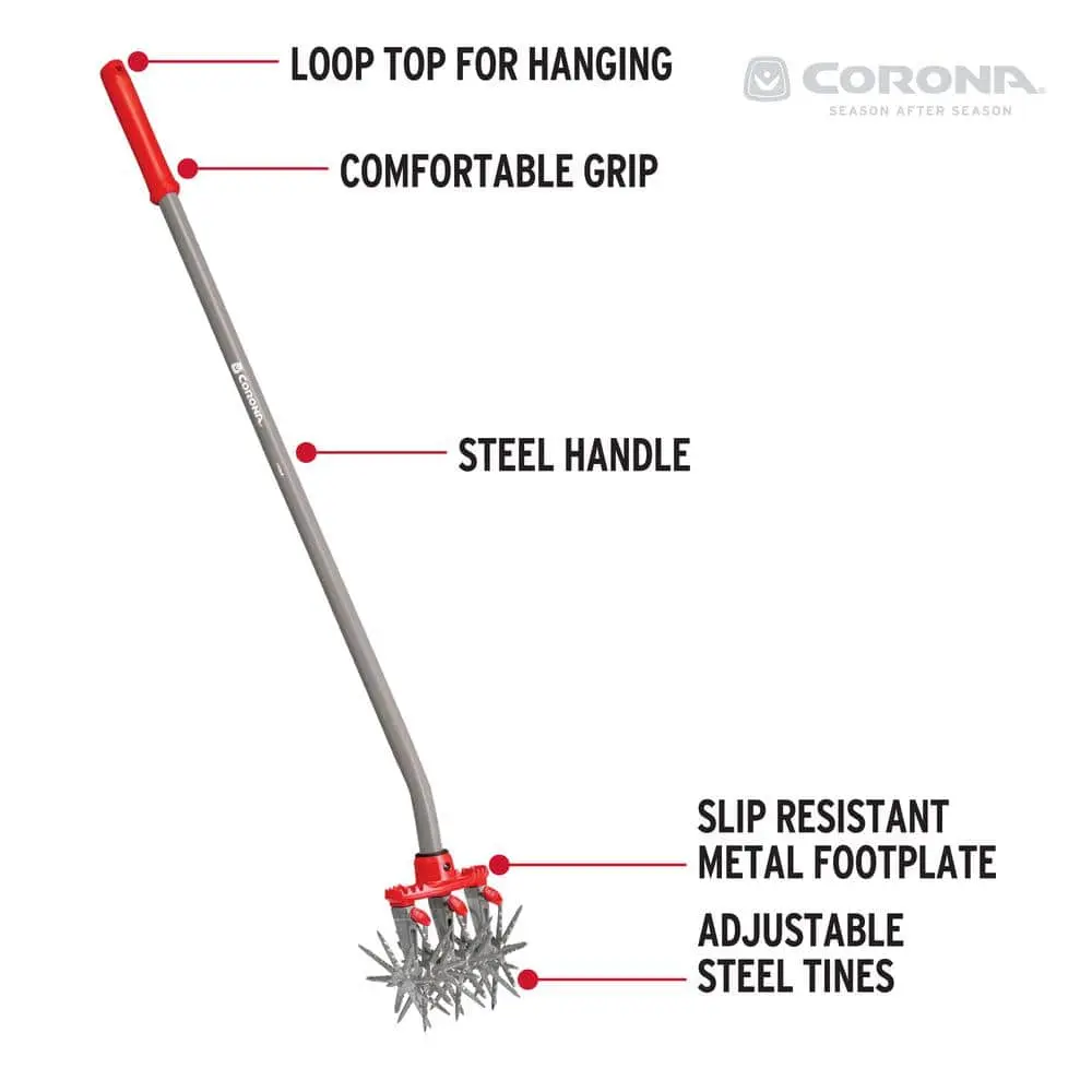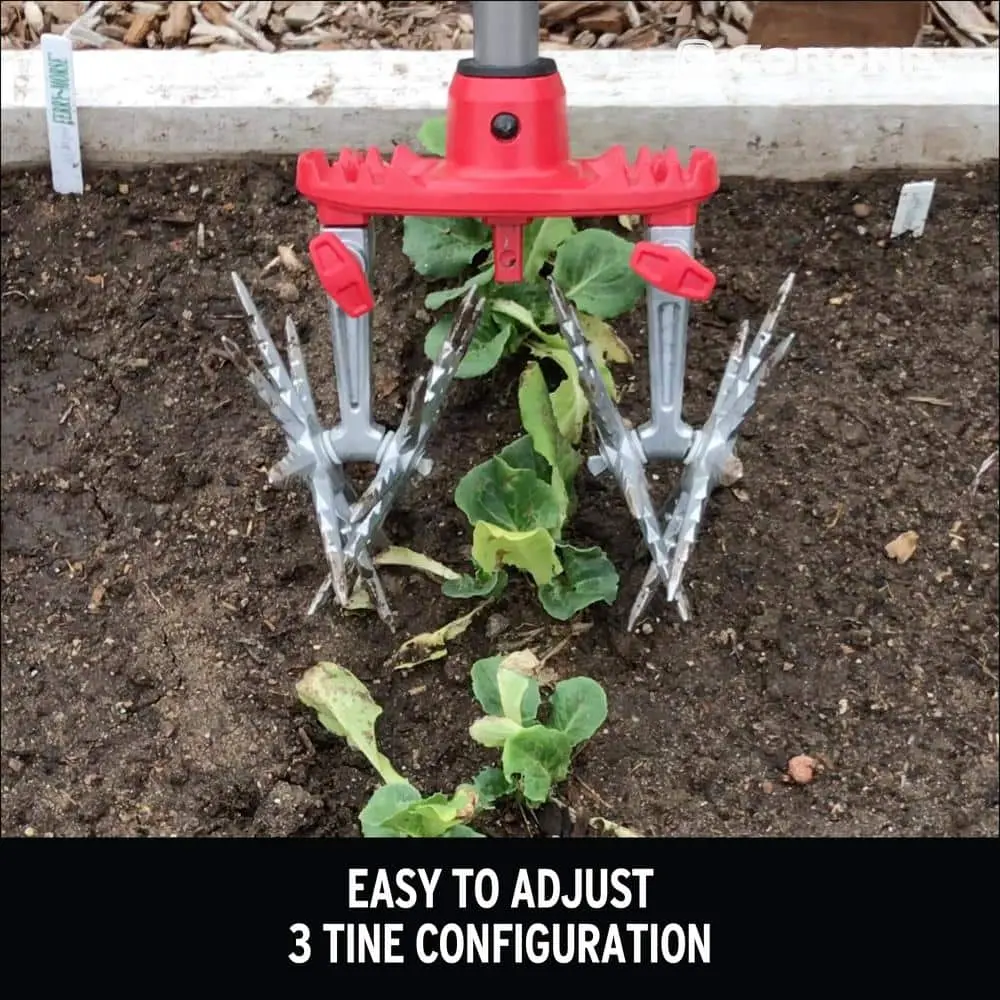 The Disc-Cultivator features 3 adjustable tine configurations, making it versatile for weeding, aerating, and tilling soil. The large steel tines efficiently break up soil, while the all-metal footplate, unlike plastic, can withstand high-pressure loads when pushing the tool into the ground. It is equipped with a 60 in. L handle for added reach and control.