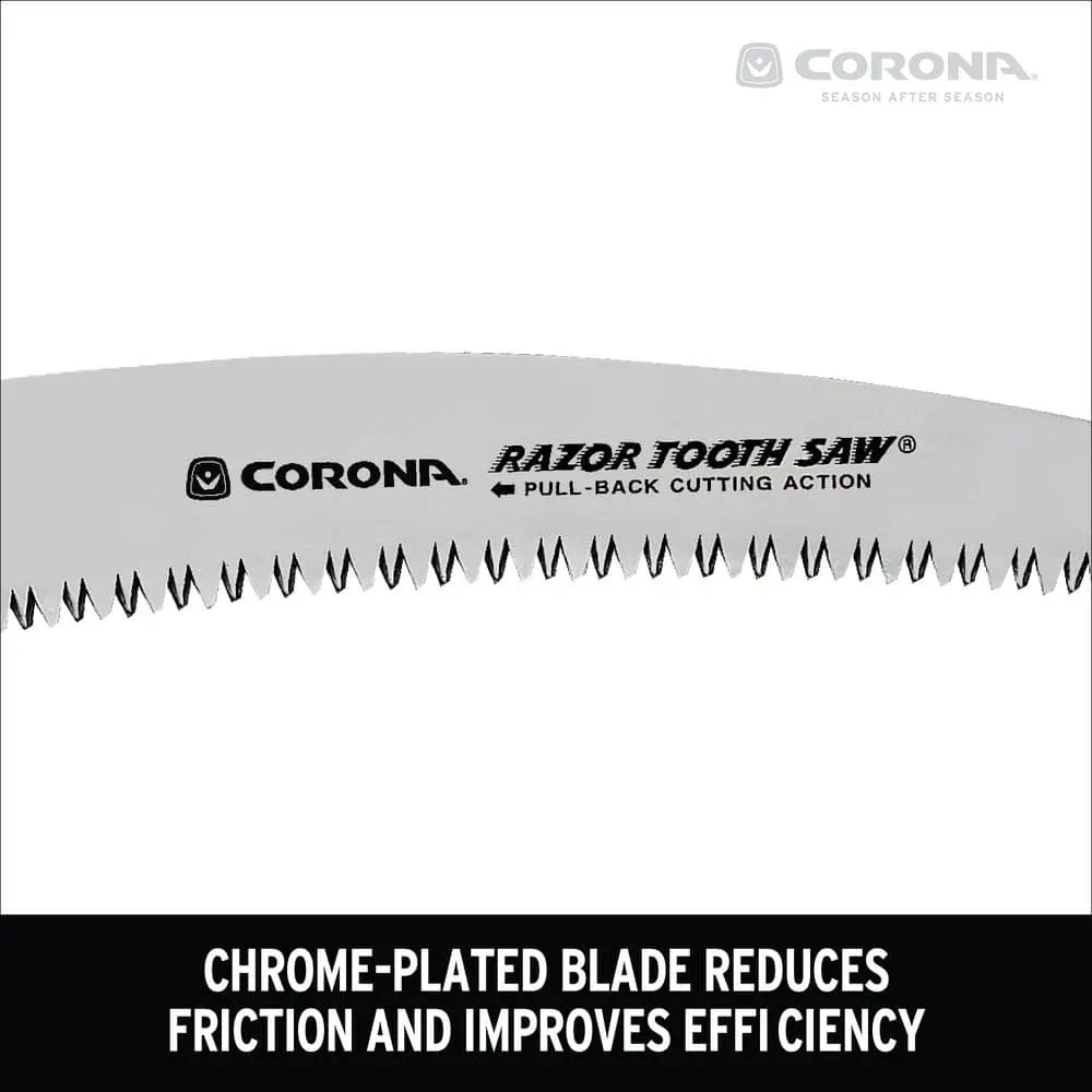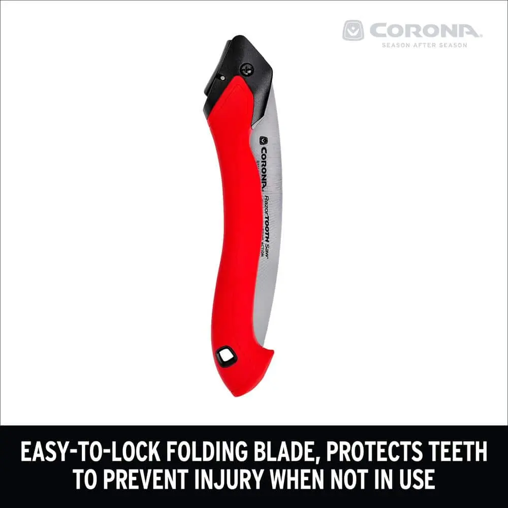 The 10-inch Corona folding saw combines RazorTOOTH SAW technology with an ergonomic, non-slip handle to provide a comfortable and secure grip while cutting through both green and dry branches at twice the speed of traditional hand saws. Its curved blade extends reach and can cut branches up to 6 inches in diameter, making it perfect for tree trimming and a valuable addition to your gardening or workshop tools. When folded, the handle completely covers the blade's teeth, ensuring safe and compact storage for easy transport during camping, hiking, backpacking, or ATV riding.