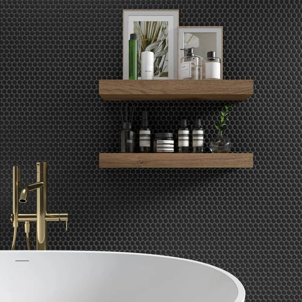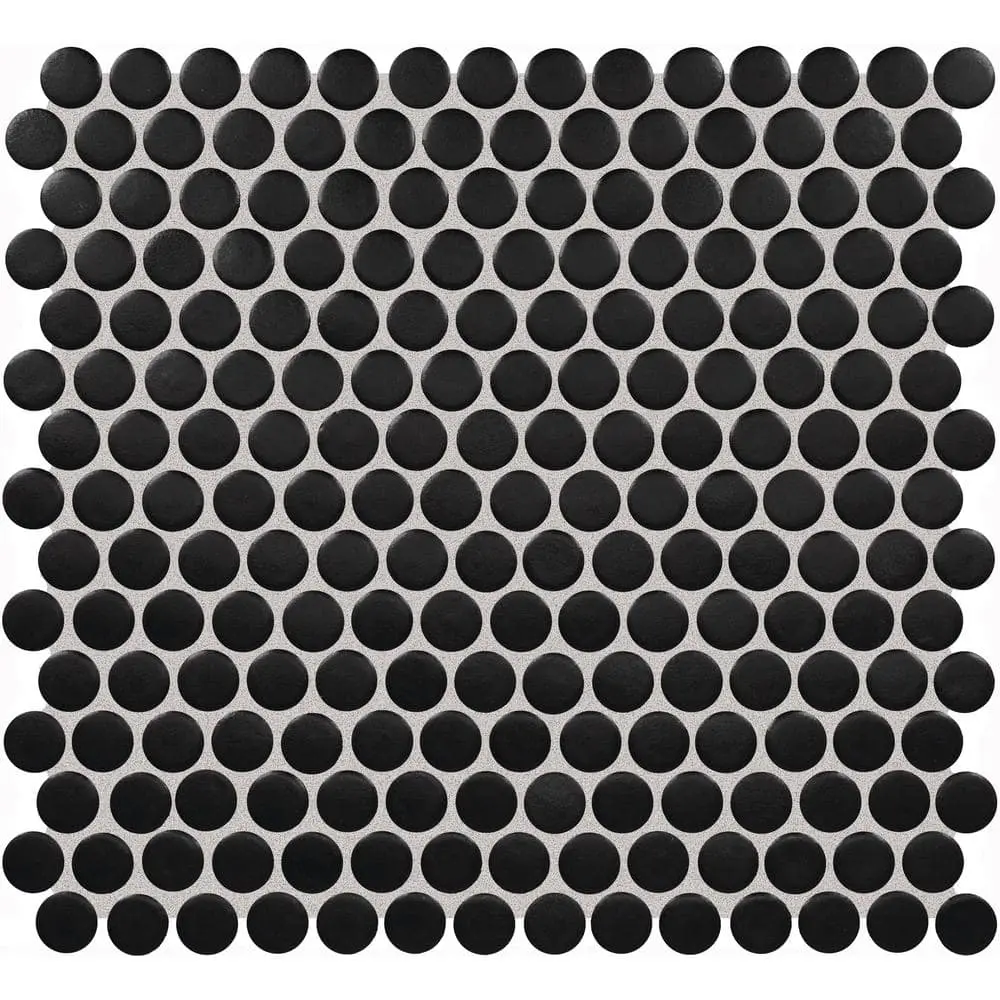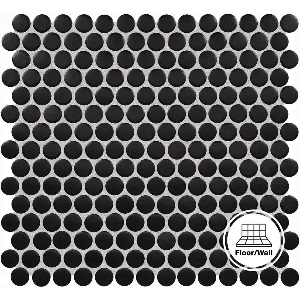 The Daltile Restore Black Glazed Ceramic Penny Round Mosaic Tile features a sleek glazed ceramic finish with a distinctive penny round mosaic pattern, perfect for adding a unique and stylish touch to your space. Ideal for walls, backsplashes, and accent areas, this tile is durable and easy to maintain, offering resistance to moisture and stains while being simple to clean. Each tile measures 11" x 10" and covers 0.83 sq. ft. per piece, making it a versatile choice for various design projects. The mesh-mounted design ensures easy installation, bringing a modern appeal to any room.