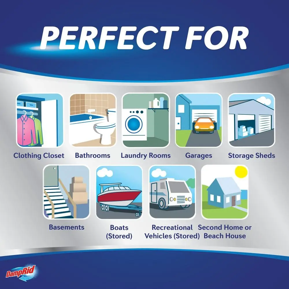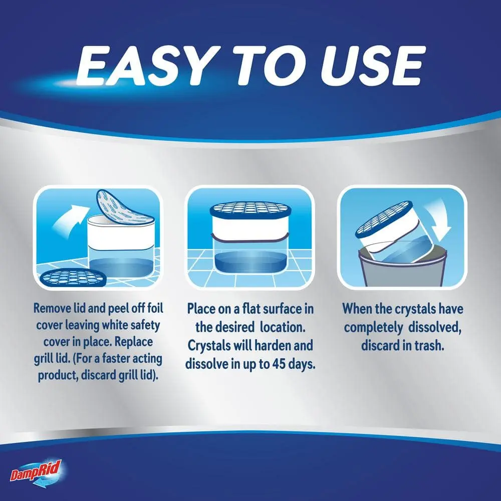 The DampRid Disposable Moisture Absorber with Activated Charcoal absorbs excess moisture and eliminates odors, leaving the air fresher and cleaner. Unlike typical odor-masking products, it effectively removes musty smells from tough sources. Ideal for spaces with limited airflow, such as bathrooms and closets, it helps combat stale, stagnant air. To use, remove the lid, peel off the foil, and place it where needed. Once the crystals dissolve, discard the canister. Each canister lasts up to 60 days. Keep out of reach of children and follow label instructions.
