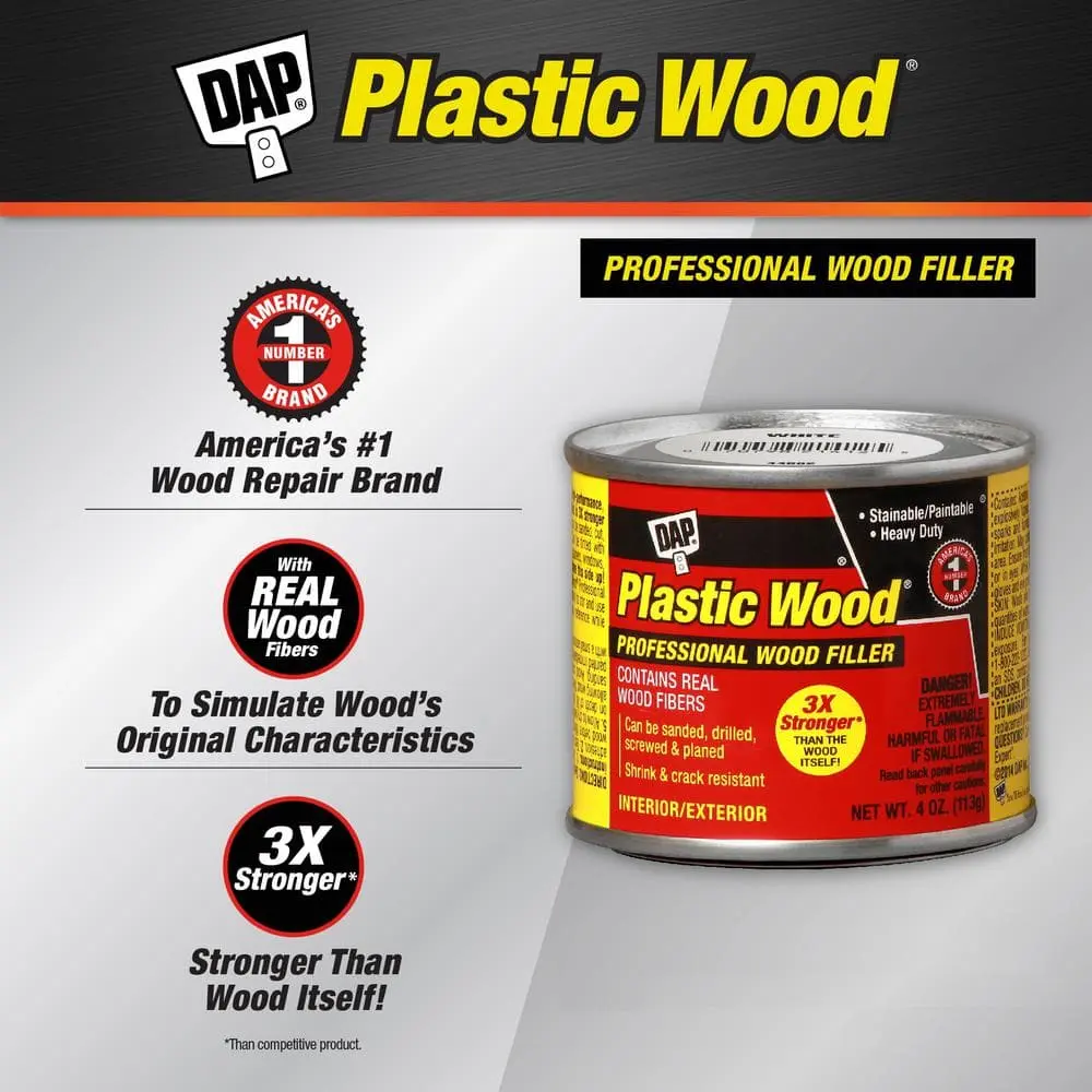 DAP Plastic Wood 4 oz. Pine Solvent Wood Filler is a durable and strong solution for repairing cracks, holes, and gouges in wood surfaces. Made with real wood fibers, it provides a natural look and feel that blends seamlessly. This fast-drying formula is both stainable and paintable, allowing for easy customization. Designed for indoor and outdoor use, it offers easy sanding and shaping, ensuring a smooth, professional finish for all your wood projects