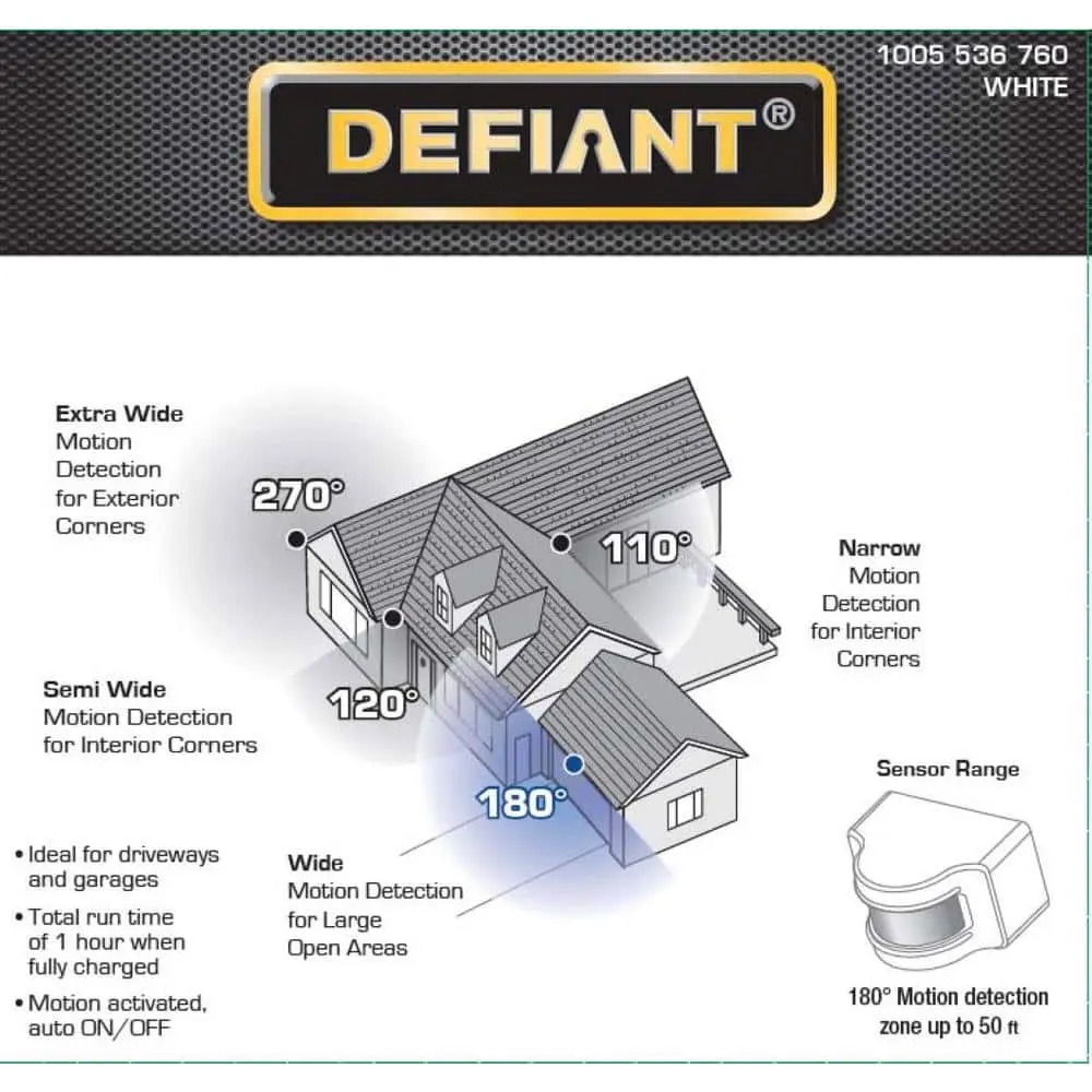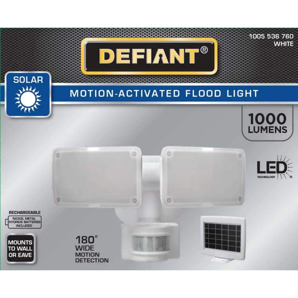 The Defiant 1,000-Lumen Solar Motion Light is a dual-head LED floodlight designed for effortless, wire-free installation. Perfect for remote areas or locations without power, it operates entirely on solar energy stored in rechargeable batteries. The motion sensor activates the light at night, delivering up to 1,000 lumens of bright illumination—ideal for enhancing security or lighting up driveways and patios.