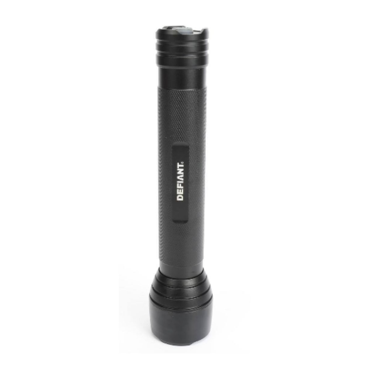 The Defiant 500 Lumens Aluminum flashlight boasts a high-power LED chip for wide, even brightness. It can shine up to 320 meters and lasts for 18 hours. With its aluminum construction, it's durable and resistant to rust and corrosion. Easy to carry and use with a one-handed design, it also features a comfortable grip for balanced handling. Plus, it comes with 3 D alkaline batteries that are easy to replace.