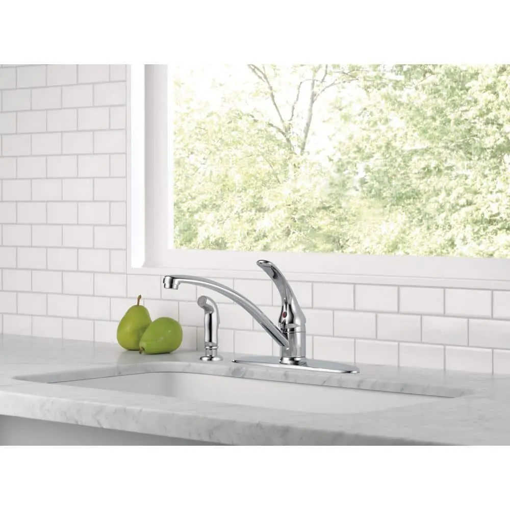 The Delta Foundations Single-Handle Integral Spray Kitchen Faucet in Chrome is designed to match a wide range of kitchen decor styles. The single-control handle allows for easy adjustment of both water flow and temperature. The color-matched side sprayer is perfect for washing food, dishes, and rinsing the sink. An escutcheon adds the finishing touch to the faucet's polished look.