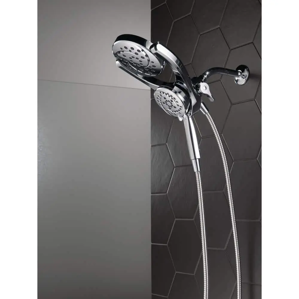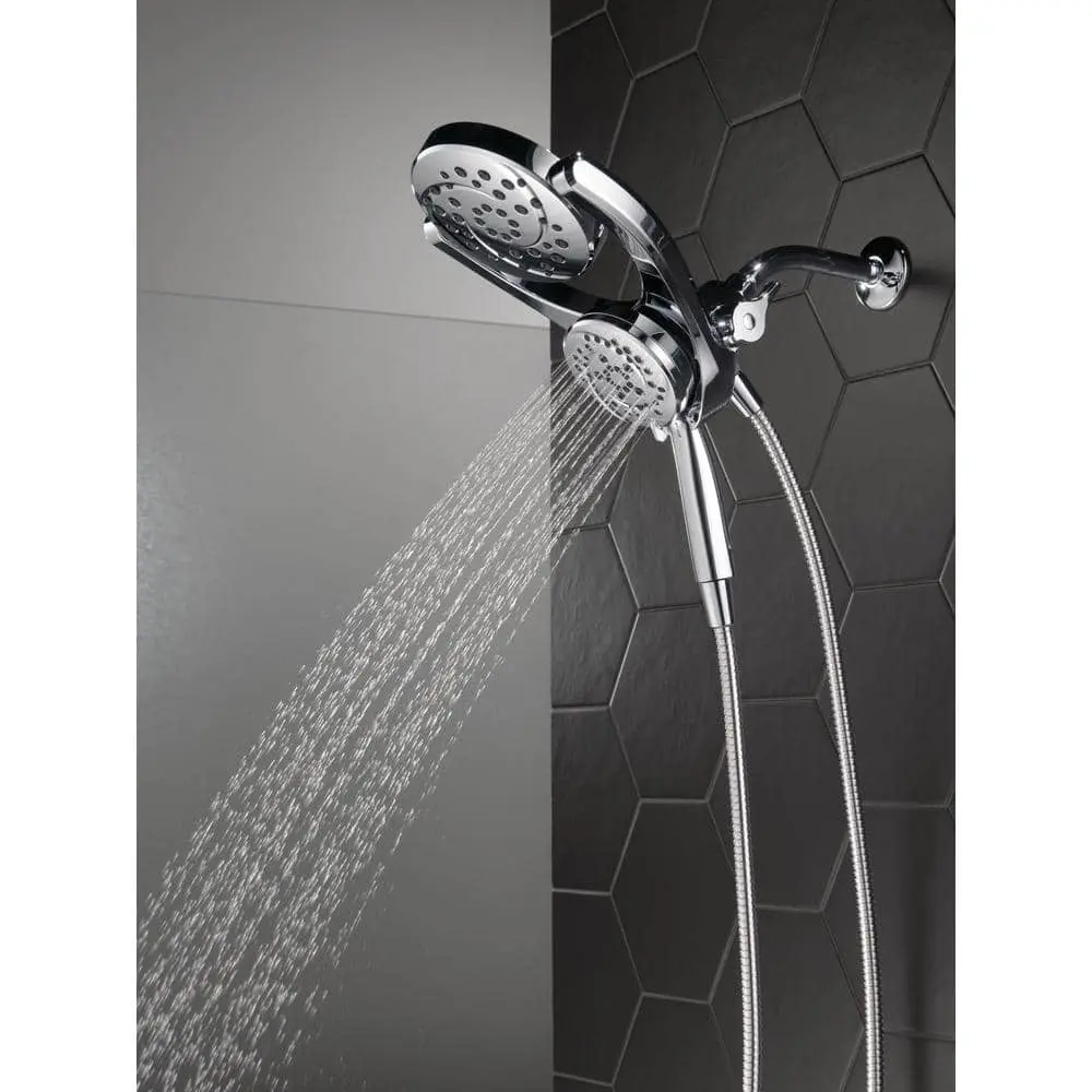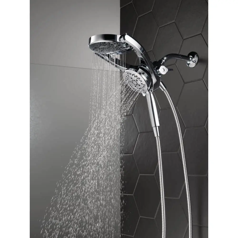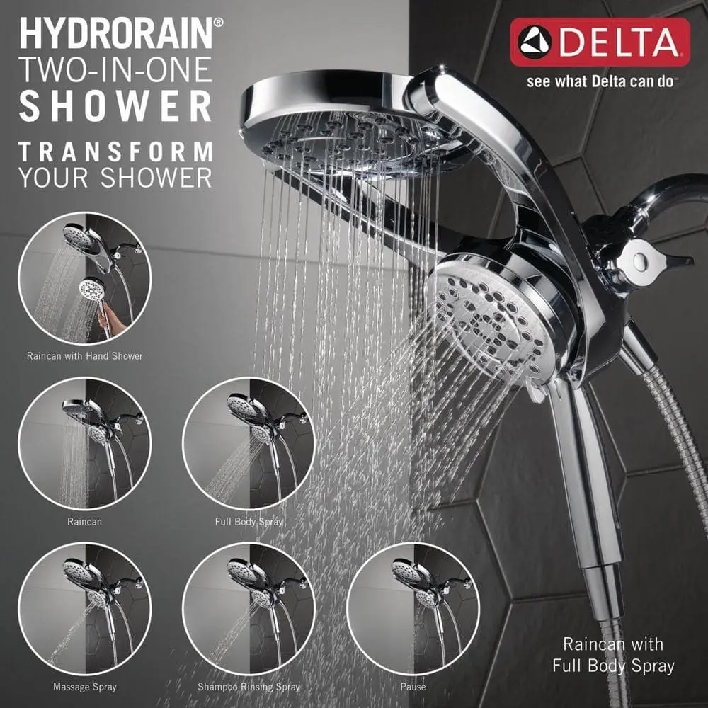 Designed to fit a standard shower arm, the HydroRain Two-in-One Shower Head with Hand Shower installs easily in just minutes, delivering a luxurious shower experience. With a pivoting rain can, you can enjoy complete control over your water flow, using the rain can, the hand shower, or both simultaneously. Delta's soft rubber Touch-Clean spray holes make it easy to wipe away mineral build-up for a fresh appearance without the need for harsh cleaners. The convenient pause setting allows you to shave, lather, or tackle other tasks without worrying about overspray or wasting water, helping you conserve your hot water supply and support environmental sustainability.
