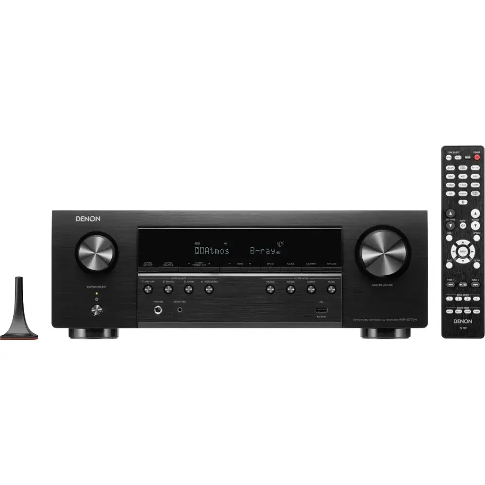 The Denon AVR-S770H 7.2-Channel AV Receiver offers 75W per channel, providing clear and immersive sound for a premium audio experience. With HEOS built-in, you can stream music wirelessly throughout your home. Enjoy cinematic sound with Dolby Atmos support, delivering enhanced 3D audio. The receiver is also 8K Ultra HD and HDR compatible, ensuring stunning visuals with high-definition video quality. Alexa compatibility allows for convenient hands-free control, while its sleek black design enhances any home theater setup