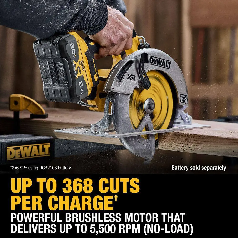 Experience the ultimate in cutting power with our 20V MAX XR 7-1/4 in. Circular Saw. Engineered with a robust brushless motor, it delivers up to 1,700 MWO and up to 368 cuts per charge, ensuring fast, precise cuts on any jobsite. Its right-side blade orientation and top handle design enhance ease-of-use and control. The built-in electronic brake stops the blade quickly for added safety. With a bevel capacity of 57 and stops at 45 and 22.5, this durable saw provides smooth, accurate performance for all your cutting needs.