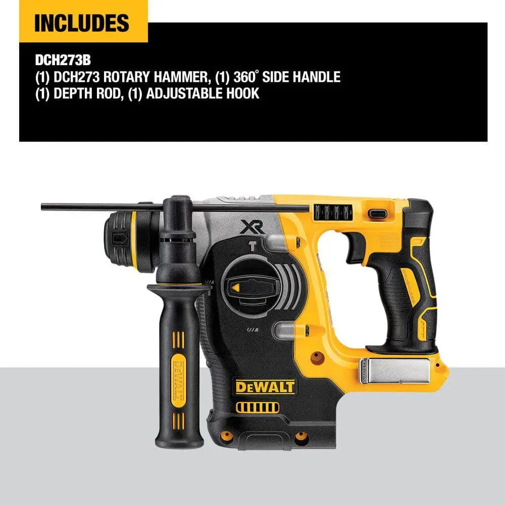 The DEWALT DCH273B 20-Volt Cordless Rotary Hammer features a brushless motor that ensures extended runtime and exceptional durability. Designed for user comfort, it incorporates SHOCKS Active Vibration Control. With built-in safeguards against dust inhalation, vibration, and tool control loss, this rotary hammer delivers the performance you expect and the safety you require.