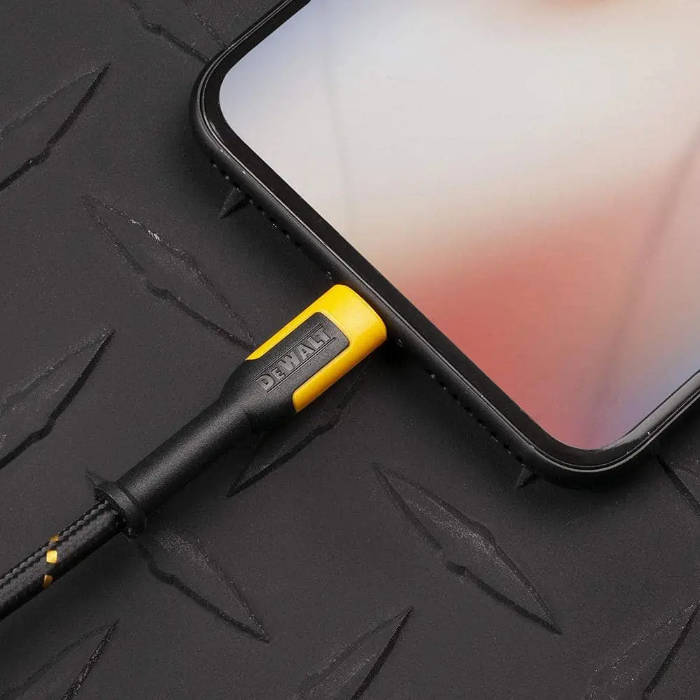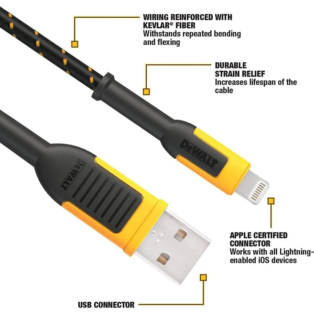 DEWALT charging cables are crafted for durability, featuring Kevlar fiber reinforcement to endure everyday wear and tear. The unified single-piece strain relief reduces stress from frequent bending, ensuring longer-lasting performance. Designed to withstand constant use, these cables outlast others on the market.