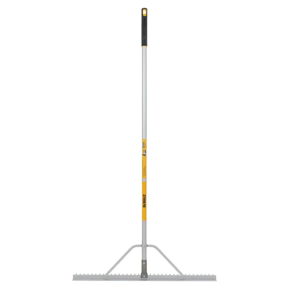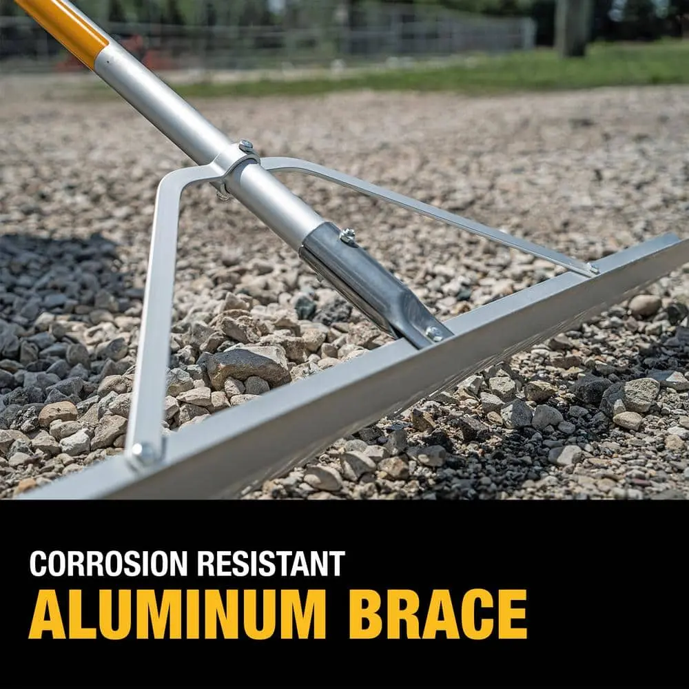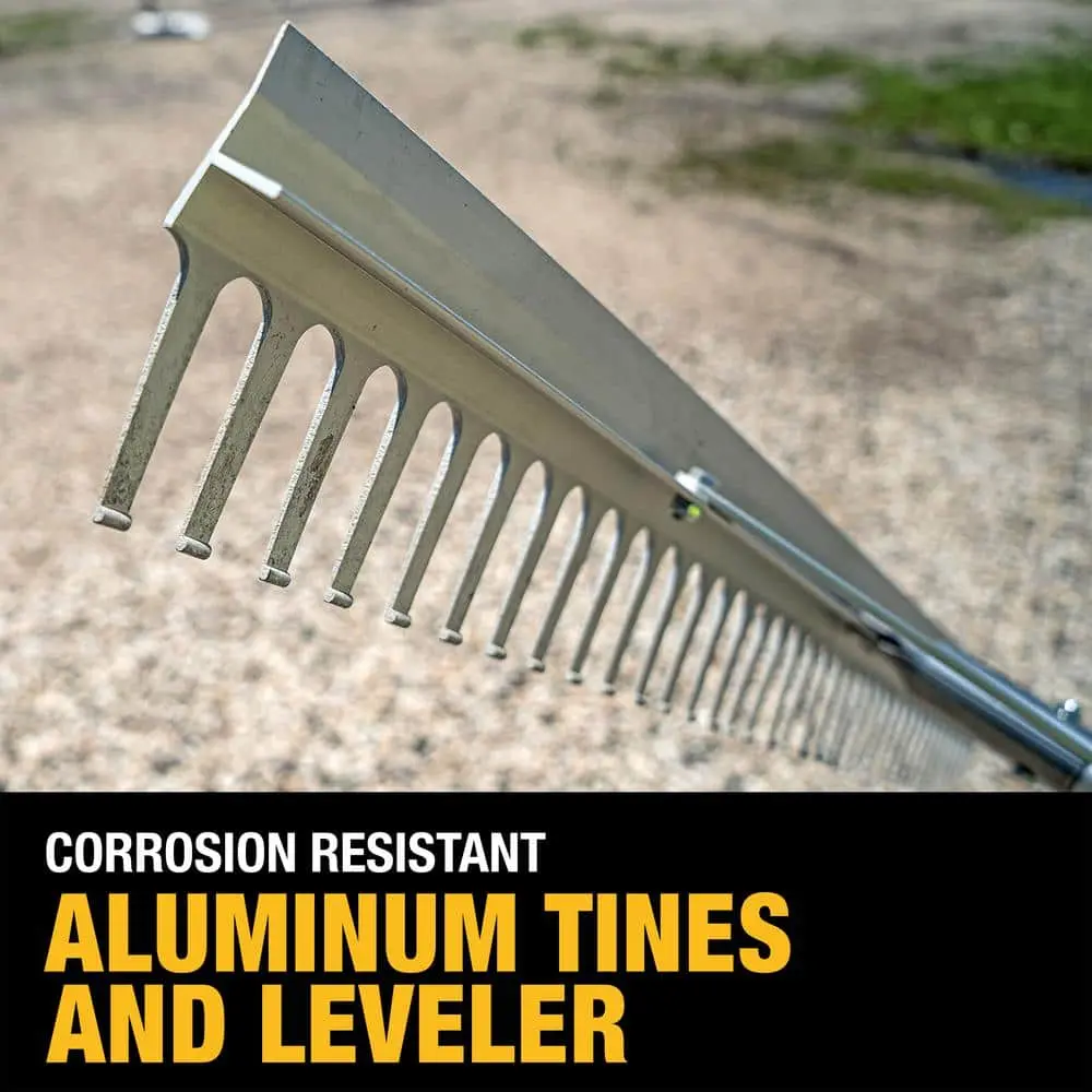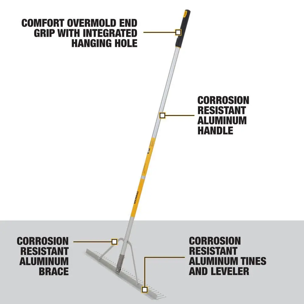 This durable landscape rake features corrosion-resistant aluminum tines and a leveler, making it ideal for smooth spreading, grading, leveling, and even removing landscape materials. The lightweight yet strong aluminum handle offers easy control, ensuring effortless use. The secure, long-lasting connection between the handle and rake head ensures professional-grade performance. Designed for comfort, the heavy-duty handle reduces strain on your knees and back during use, while the overmold end grip enhances hand comfort during extended sessions. For easy storage, an integrated hanging hole is included on the handle’s end.