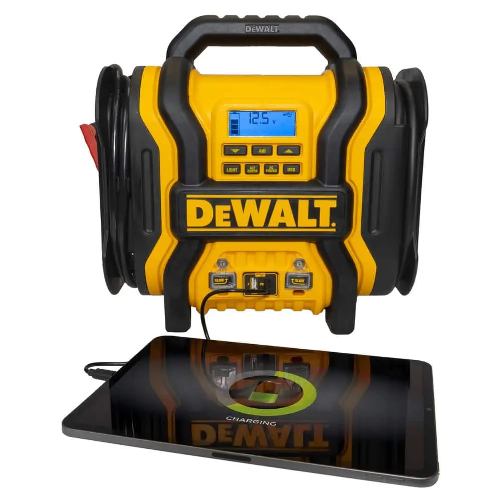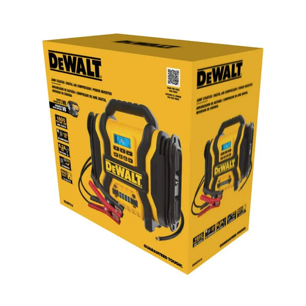 The DEWALT DXAEPS14 professional-grade power station is one of our most powerful jump starters, delivering 2000 peak amps to start vehicles up to V8. It includes a 500-Watt AC inverter, 15W USB-A port, 25W USB-C PD port, 120 PSI digital compressor, and an LED work light, all in a compact and portable design. Ideal for tailgating, camping, or roadside emergencies, the DXAEPS14 is the perfect solution whether your car won’t start, your phone’s battery is low, or your tire needs air.