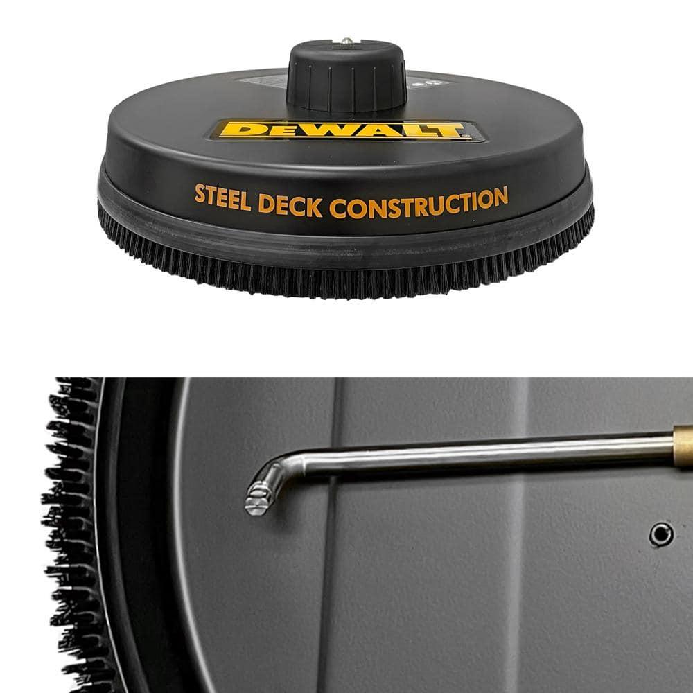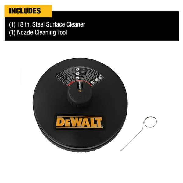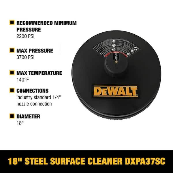 This surface cleaner features two high-pressure, rotating jets designed to deliver fast and streak-free cleaning. Constructed with a robust powder-coated steel shroud and durable stainless steel nozzles, it ensures long-lasting performance. The cleaner has a pressure rating of up to 3700 psi and is universally compatible with standard 1/4-inch quick-connect spray wand connections, making it suitable for most gas-powered pressure washers. With its 18-inch diameter, it effectively cleans large areas such as garage floors, driveways, patios, and decks quickly and efficiently. This model is intended for use with cold water only.