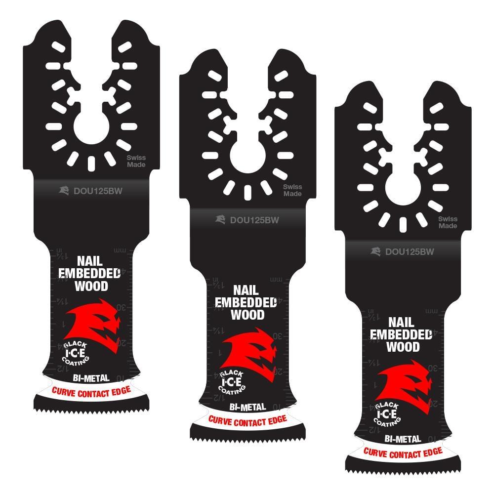Diablos Demo Demon Universal Fit Bi-Metal Oscillating Blades are designed for maximum durability and extended life in nail-embedded wood. They feature an ultra-hardened cutting edge for up to 5X longer life than standard bi-metal blades. The curved contact edge ensures precise, clean plunge cuts with reduced vibration. Black I.C.E (Industrial Cooling Element) prevents tooth buildup for fast, clean cuts. The universal fit design attaches to most tools without adapters, except Starlock tools.