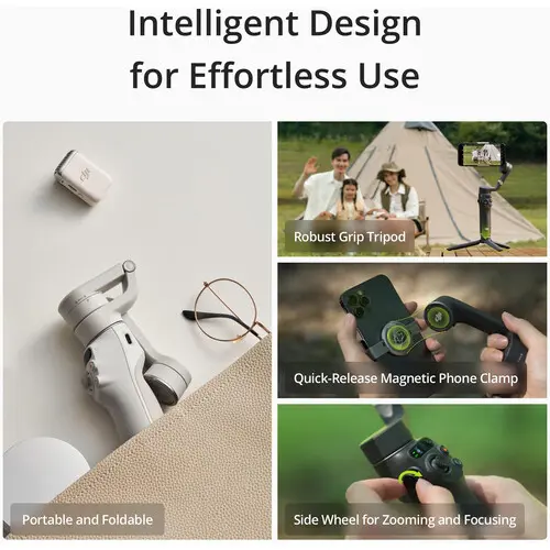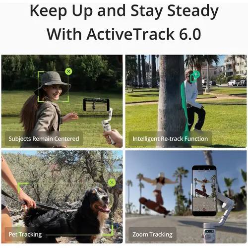 Simply unfold the gimbal, snap on your smartphone (up to 3.3" wide) using the magnetic clamp, and you're ready to shoot. No need to remove your phone case. - 3-Axis Stabilization with ActiveTrack 6.0