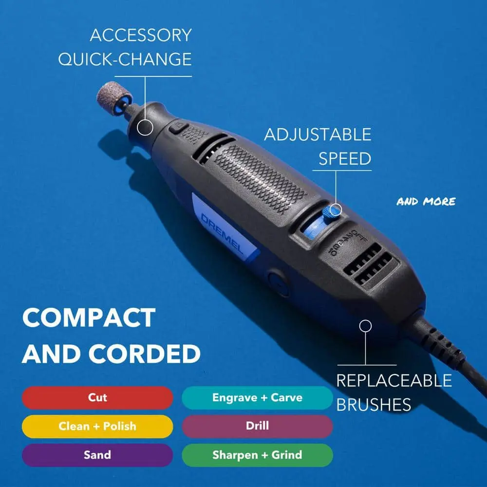 The Dremel 3100 is a versatile and high-performing rotary tool designed to handle a wide array of tasks. Whether you're tackling home repairs or engaging in arts and crafts projects, this mid-range corded rotary tool offers reliability and precision. Equipped with a powerful 1.2 AMP variable-speed motor, it provides five speed settings ranging from 5,000 to 35,000 RPM, giving you complete control over your projects. Its compact, ergonomic design and flexible 6-foot cord ensure comfort and endurance during extended use. Additionally, the 3100 is crafted with sustainability in mind, featuring a tool housing made from recycled plastic and eco-friendly packaging.