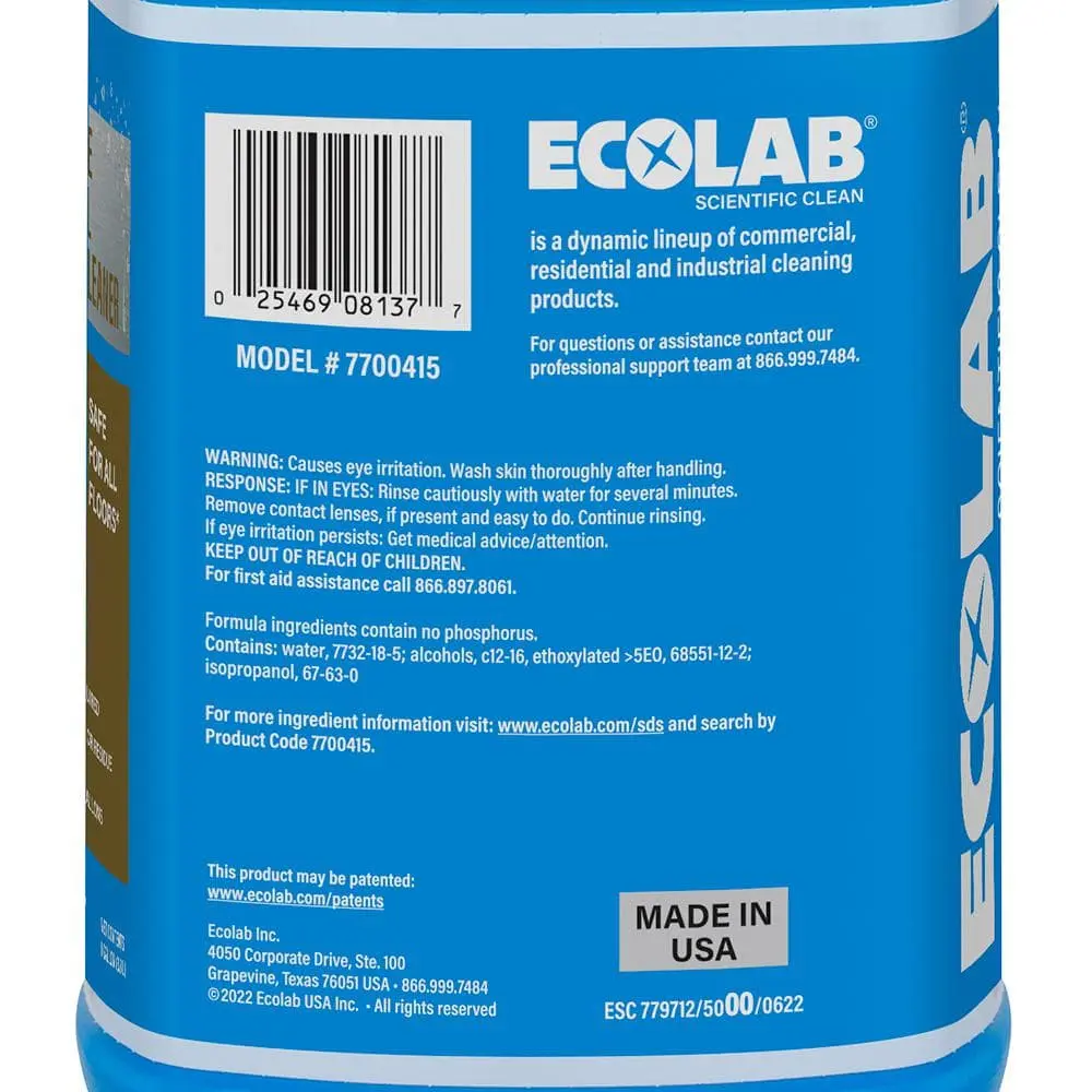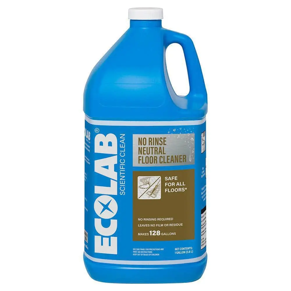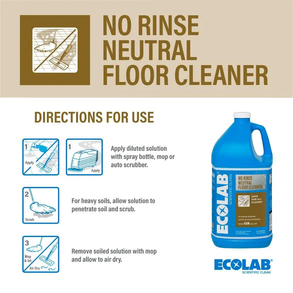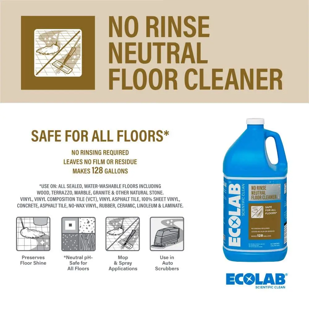 The No Rinse Neutral Floor Concentrate Cleaner helps preserve the shine of your floor finish. This formula delivers excellent cleaning performance on various surfaces, including vinyl, VCT, wood, terrazzo, linoleum, concrete, marble, granite, and other natural stone. It is safe for all sealed, water-washable floors and has a fresh, clean scent. This pH-neutral cleaner can be used with a string mop, spray mop, or auto scrubber. It makes up to 128 gallons of solution: mix 1 oz. of concentrate with 1 gallon of water, or for heavy soils, mix 4 oz. with 1 gallon of water. For enhanced shine, finish with Ecolab high gloss wet look floor finish or high-traffic low-maintenance floor finish.