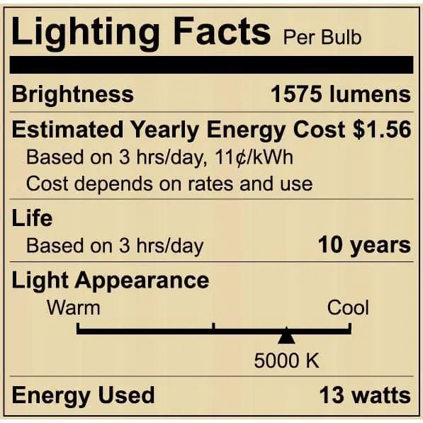 Upgrade to energy-efficient LED bulbs and start saving on your electricity bill. These 13-Watt LED bulbs provide the same brightness as a traditional 100-Watt incandescent bulb without the excess heat, making them a safer and more efficient option for your home. Rated for up to 11,000 hours of use, you won’t have to replace them often. The 5000K color temperature gives off a natural daylight-like light, perfect for spaces such as your bathroom, office, living room, kitchen, or anywhere you need bright, crisp illumination.