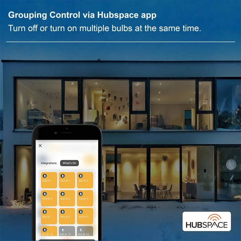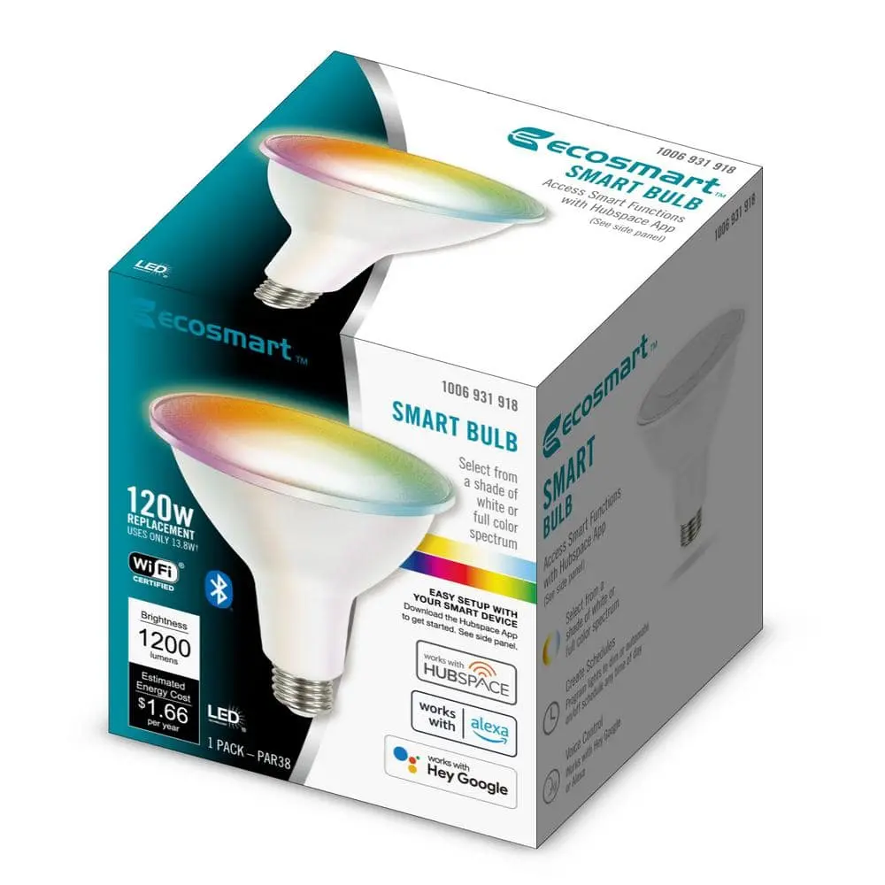 EcoSmart's 120-Watt Equivalent PAR38 Smart LED Light Bulbs offer an easy and efficient way to upgrade to smart home lighting without needing a hub. These color-changing LED bulbs allow you to customize your lighting wirelessly through your existing Wi-Fi or Bluetooth connection. With Bluetooth, you can maintain local control even when Wi-Fi is offline, ensuring a reliable connection. Manage the bulbs via the Hubspace app or compatible voice control devices. Each energy-efficient bulb uses only 13.8 watts to produce 1200 lumens, equivalent to a 120-watt incandescent bulb. Featuring tunable white technology, the bulbs provide adjustable color temperatures from 2200K (Amber) to 6500K (Daylight) and over 16 million color options, making them perfect for any space. Available in additional shapes, including A19, A21, and BR30.