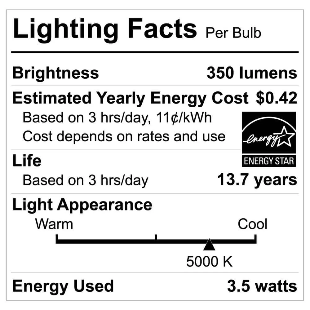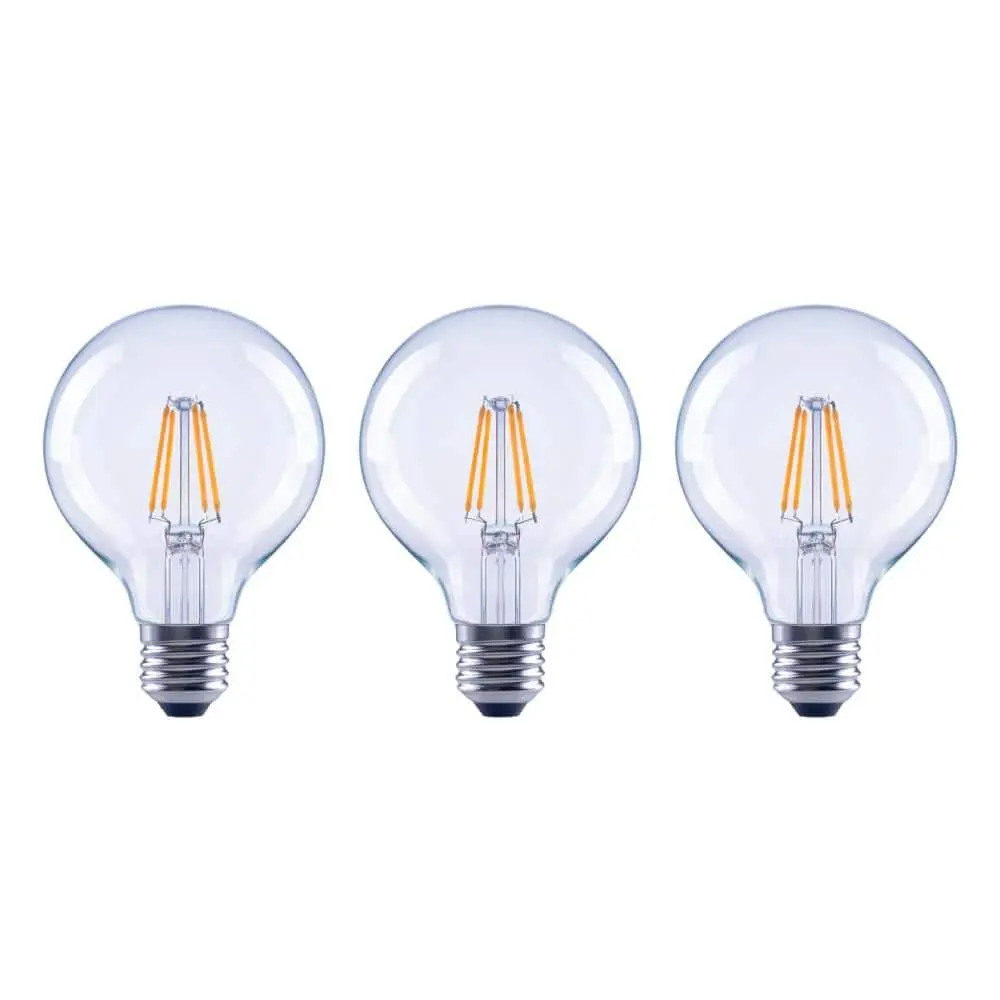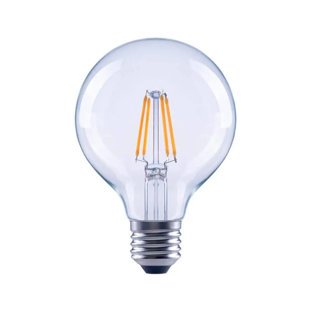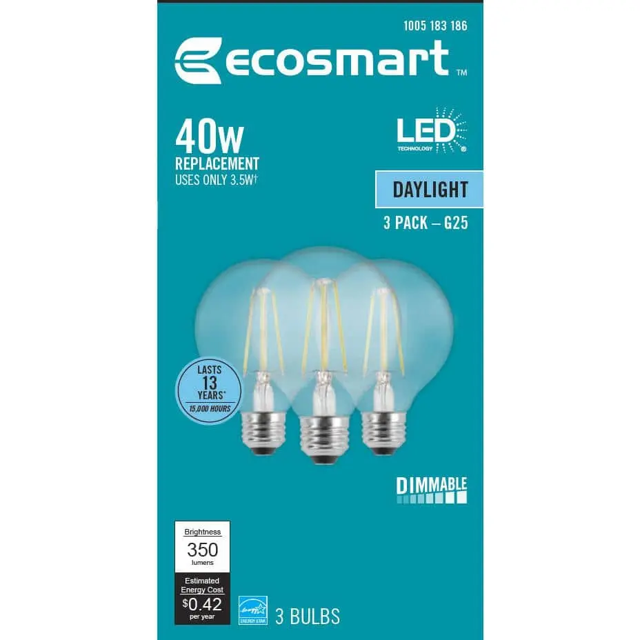 The EcoSmart 40-Watt equivalent G25 filament LED bulb is a stylish, energy-efficient replacement for traditional incandescent bulbs, offering all the benefits of LED technology. This dimmable bulb features a clear all-glass exterior and provides a 360° omni-directional light distribution. It uses only 4 watts of energy, offering a 90% energy savings compared to traditional bulbs. Emitting a bright, crisp 5000K (Daylight) color temperature, it’s ideal for creating an energized atmosphere in living rooms, kitchens, bathrooms, and bedrooms. The bulb’s high color rendering index (90 CRI) ensures vibrant, accurate colors. With a lifespan of 15,000 hours, it’s a reliable choice for home and office lighting. Start saving today with EcoSmart!