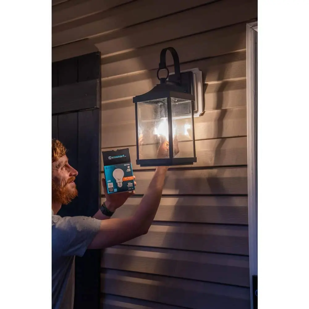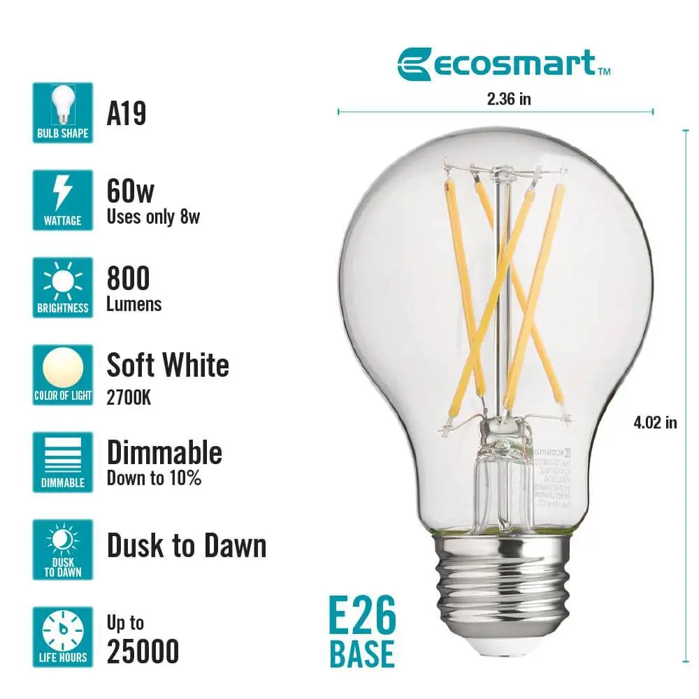 Transform any fixture into a dusk-to-dawn light with the EcoSmart A19 LED bulb, equipped with a built-in light sensor. This sensor automatically turns the bulb on at dusk and off at dawn. Ideal for outdoor spaces like entryways, porches, and backyards, where you need automatic lighting. The A19 LED bulb mimics the traditional incandescent look, featuring an A-line shape and medium (E26) base. Consuming only 8 watts of energy, it emits 800 lumens, offering the same brightness as a 60-watt incandescent bulb. The soft white (2700K) color creates a warm, welcoming glow.