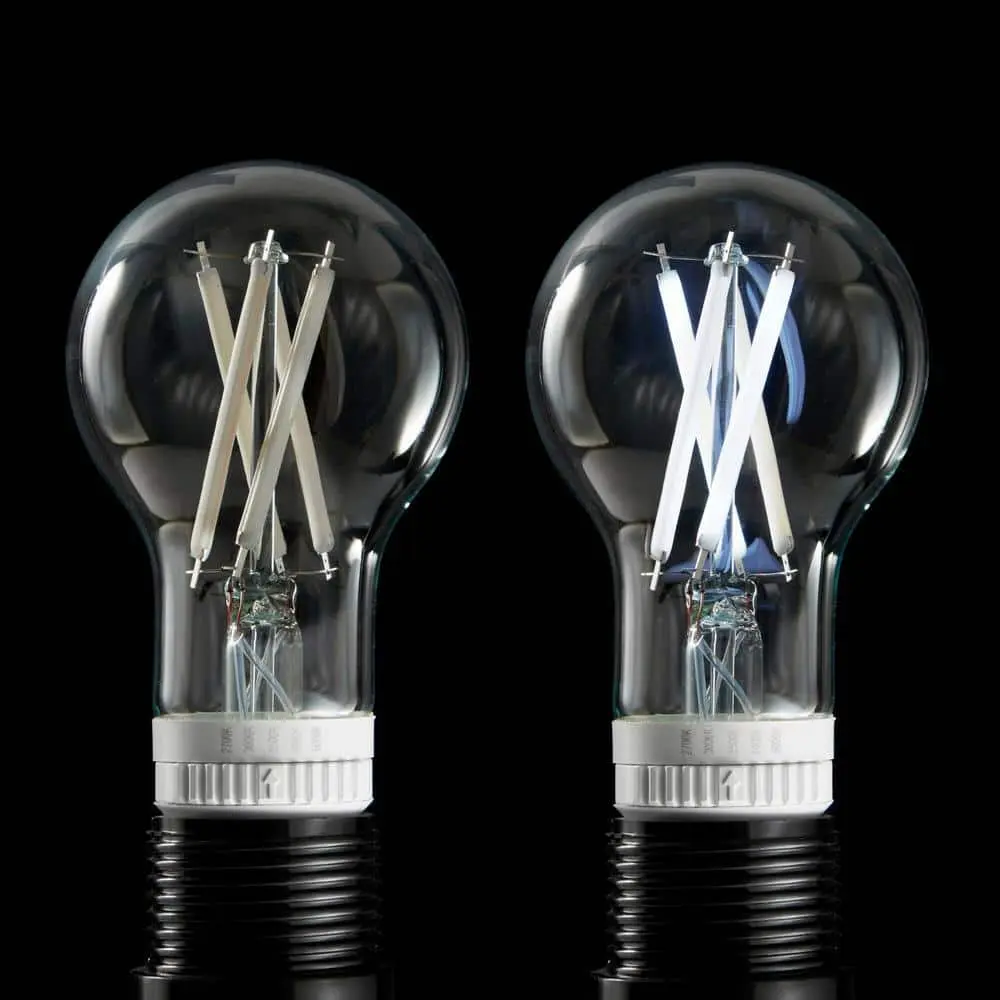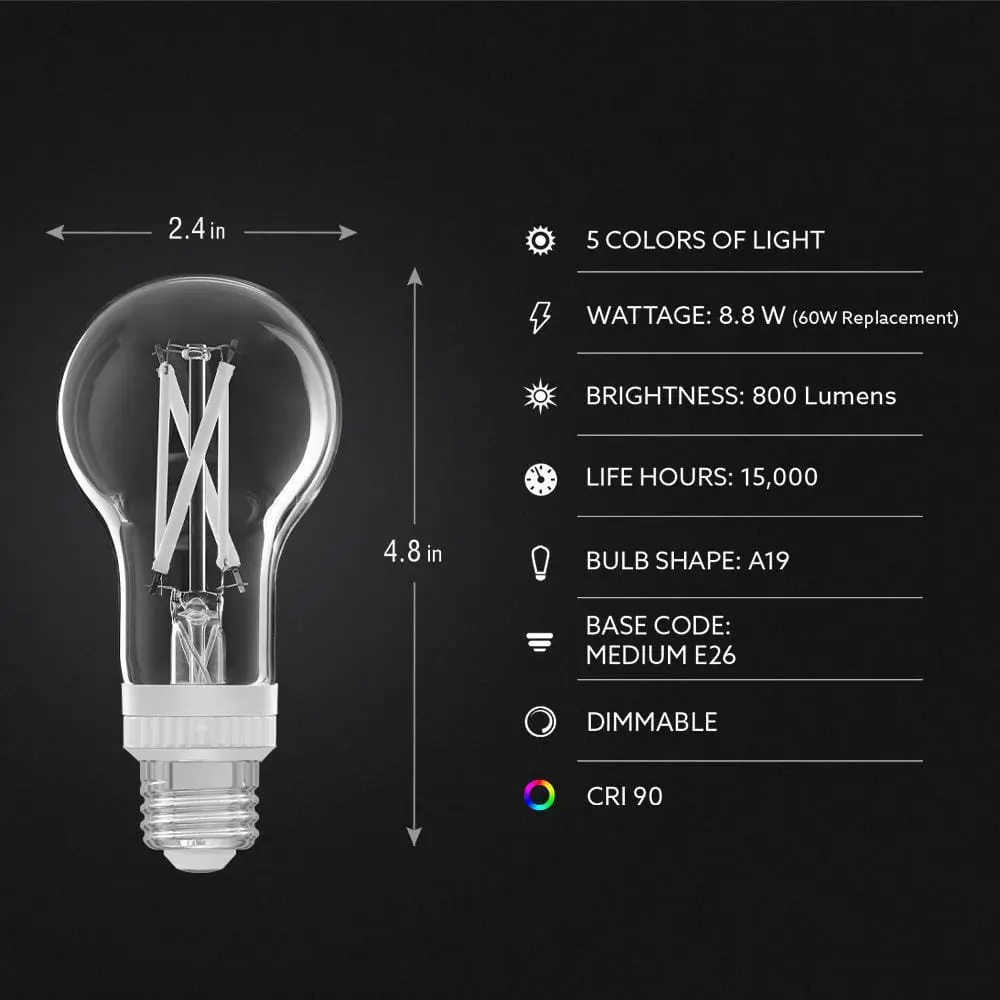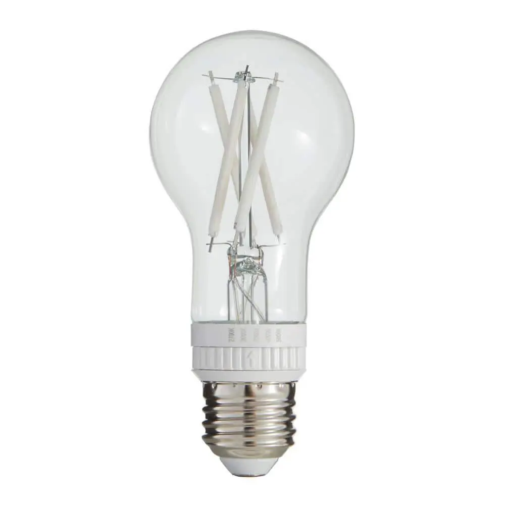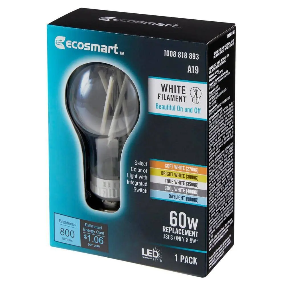 Enhance your lighting with EcoSmart's stylish Exposed White Filament LED Bulbs, offering a modern twist on classic vintage bulbs. These innovative bulbs combine traditional clear glass A-shape designs with sleek, low-profile white filaments. Unlike yellow filaments, they seamlessly blend into any decor, providing a timeless look that suits any room. Offering dimmable lighting in 2700K, 3000K, 3500K, 4000K, or 5000K, they are ideal for spaces such as craft rooms, kitchens, bathrooms, and laundry rooms, providing a bright and invigorating atmosphere. The bluish-white light is perfect for tasks that require precision, like reading or working on detailed projects. These bulbs fit in any medium (E26) base fixture and are perfect for both general-purpose and decorative lighting. The A19605CCTCA/WFIL/ECP bulb produces 800 lumens while consuming just 8.8 watts, which is up to 85.3% more energy-efficient than a standard 100-watt incandescent bulb. With a high CRI of 90+, they bring out vibrant, true-to-life colors, and they can last up to 15,000 hours, with an estimated annual energy cost of only $1.06. Whether for residential or commercial use, these bulbs provide a stylish touch to any space.