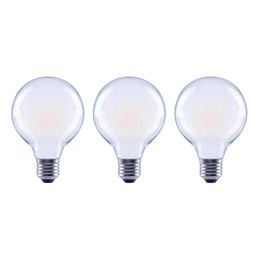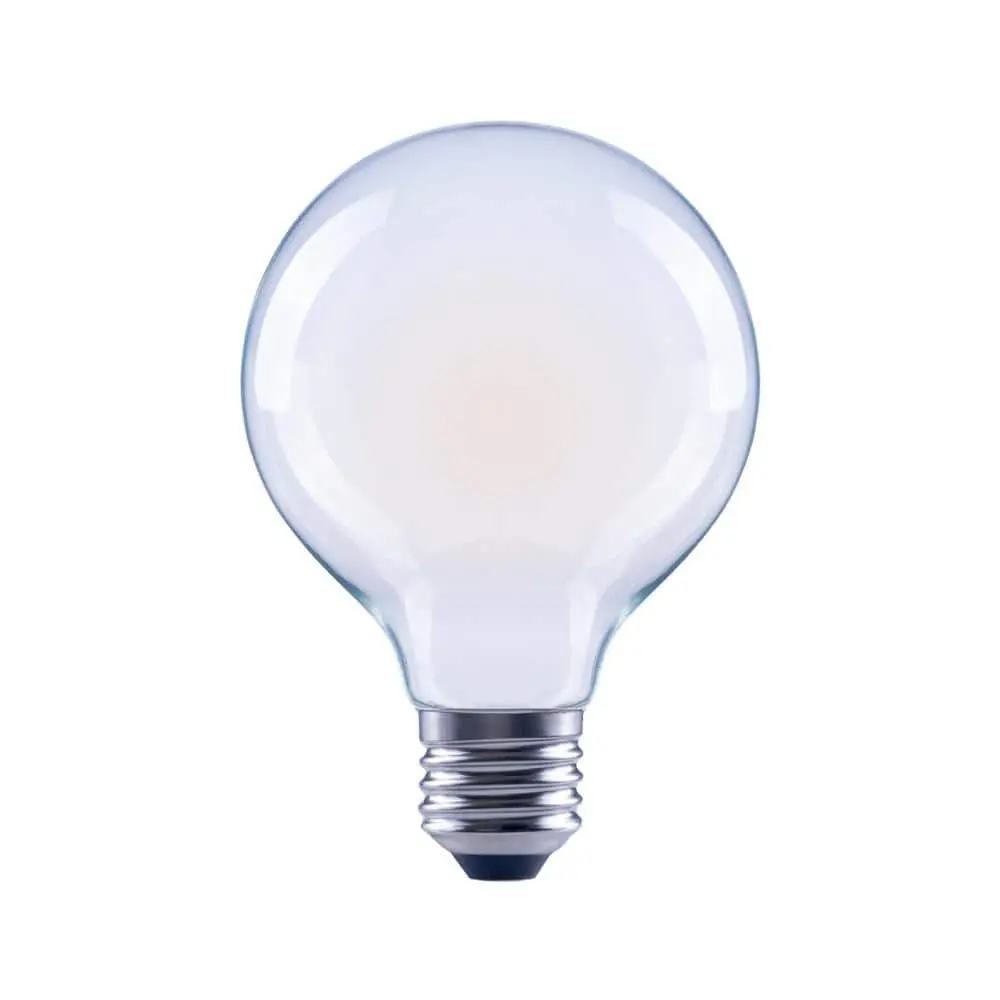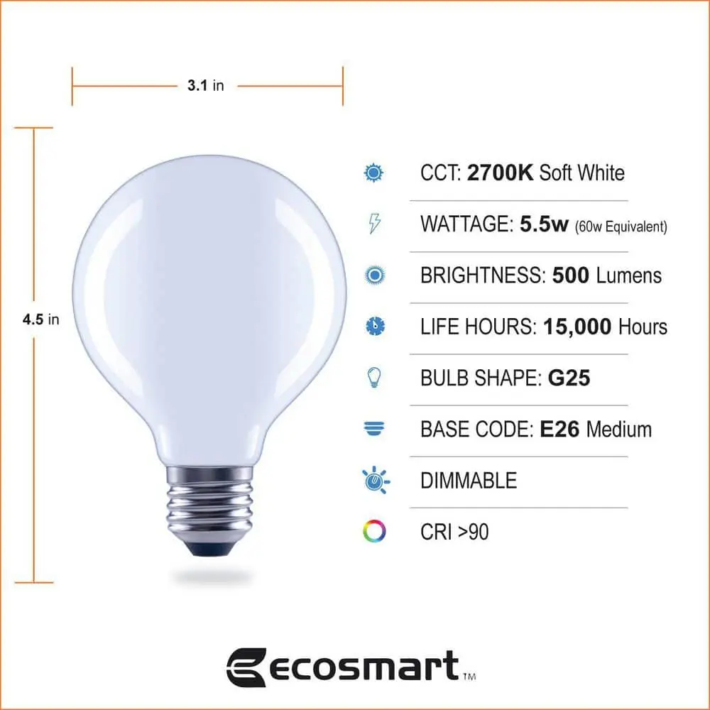 The EcoSmart 60-Watt Equivalent G25 filament LED light bulb offers a stylish and energy-efficient replacement for traditional incandescent bulbs. Featuring a frosted all-glass exterior, this dimmable bulb provides omni-directional (360°) light distribution. With just 5.5 watts of energy use, it offers an impressive 91% energy savings over standard lighting, helping lower your electricity bill. The soft white 2700K color temperature creates a relaxing, balanced atmosphere ideal for living rooms, kitchens, bathrooms, and bedrooms. With a long 15,000-hour lifespa, this LED bulb is perfect for both home and office use. Enjoy energy savings without sacrificing style with EcoSmart.