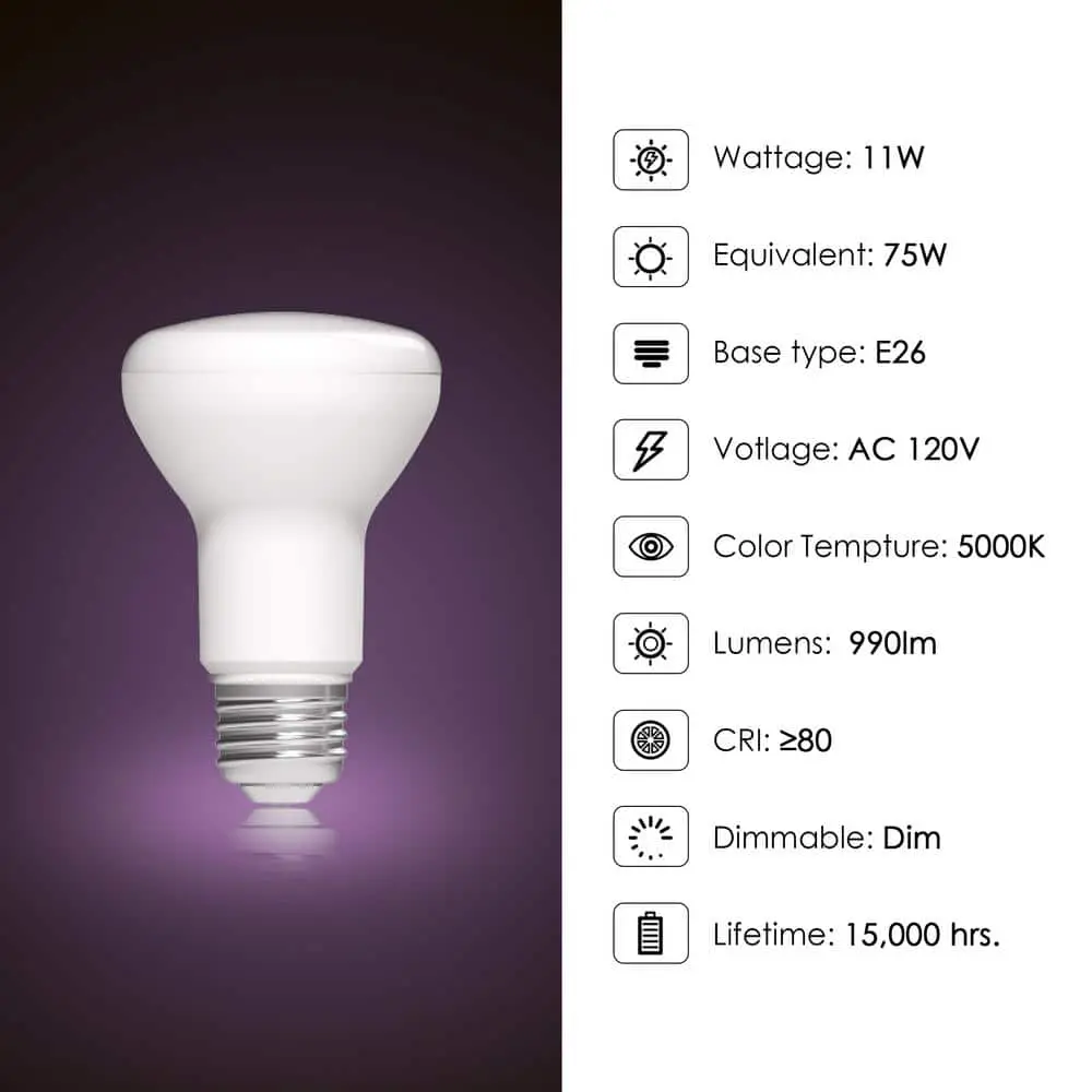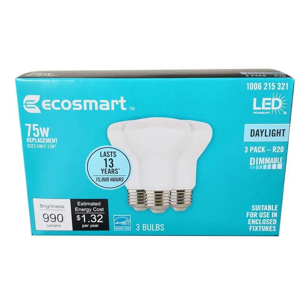 Enhance your lighting with the EcoSmart 75-Watt equivalent R20 Dimmable Flood LED Light Bulbs. Replace your traditional incandescent bulbs with these LED options and enjoy all the benefits of energy efficiency. Rated for 15,000 hours and with an estimated yearly cost of just $1.32 to operate, these energy-saving bulbs use 85% less energy than standard incandescent bulbs. Consuming only 11-Watts, they deliver 990 Lumens of Daylight (5000K) light, offering brightness comparable to a 75-Watt incandescent bulb. The daylight color temperature creates a bright, crisp ambiance, perfect for living rooms, kitchens, bathrooms, and bedrooms. Adjust the dimmable feature to set the light from bright daylight to a softer, relaxed glow. Ideal for use in enclosed fixtures and as replacements for indoor recessed and track lighting. Start saving today with EcoSmart.
