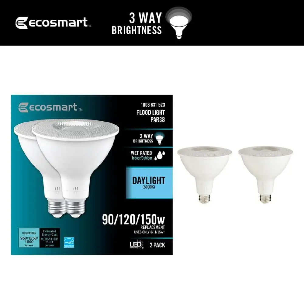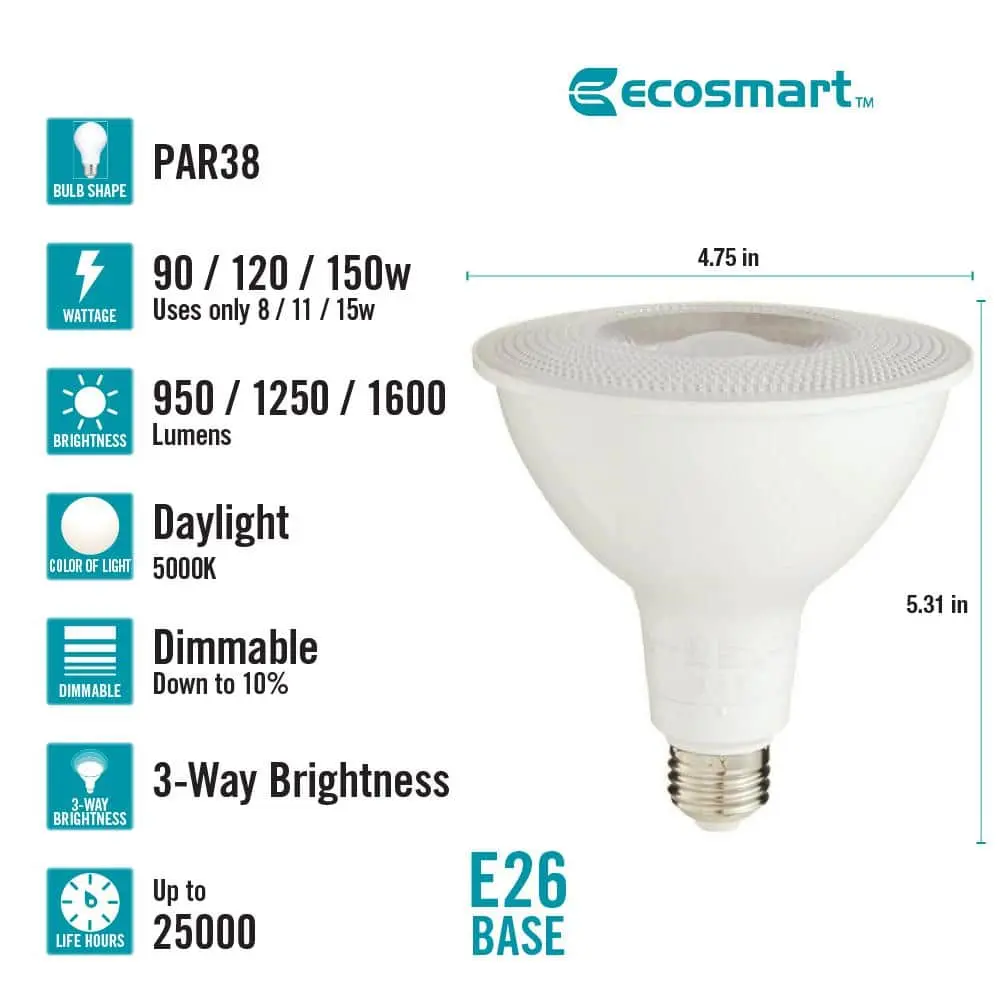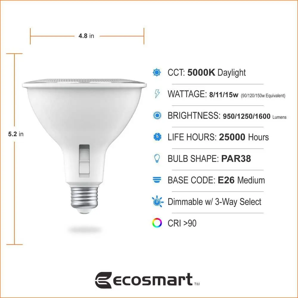 The EcoSmart PAR38 3-Way LED light bulb, offering 90/120/150-Watt equivalents, provides an excellent energy-efficient replacement for traditional incandescent bulbs. These dimmable bulbs are ENERGY STAR certified, helping you save on your energy bill each month. Using only 8/11/15 watts of energy, they offer up to 90% energy savings compared to conventional lighting. With a 5000K Daylight color temperature, they create an energizing and balanced atmosphere in any space, making them ideal for living rooms, kitchens, bathrooms, and bedrooms. These EcoSmart LEDs are suitable for both indoor and outdoor use (wet rated), with a high 90 CRI for superior color accuracy. With a 25,000-hour lifespan, these bulbs are perfect for long-lasting and efficient lighting. Start saving today with EcoSmart.