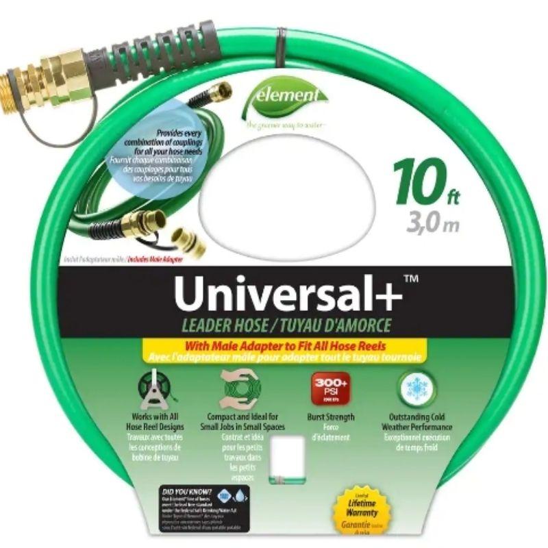 Element Universal+ 1/2 in. x 10 ft. Heavy Duty Leader Hose is a durable and versatile hose designed for various outdoor watering and gardening tasks. Here’s a detailed description of its features: Dimensions Fitting Diameter (in.):.50 Hose Diameter (in.):1/2 Hose Length (ft.):10 ft Product Depth (in.):10 in Product Height (in.):1 in Product Width (in.):10 in Burst Pressure (psi):400 Coiled:Yes Color Family:Multi-Colored Commercial / Residential:Residential Duty Rating:Heavy Features:Non-Toxic Hose Type:Leader Hot Water Use:No Lead Free:Yes Pack Size:10 Product Weight (lb.):1.2 lb Material: Constructed from heavy-duty materials, typically featuring a reinforced design that enhances its durability and resistance to kinking, abrasion, and weathering. The material ensures long-lasting performance and reliable use. Design: The hose is designed for flexibility and ease of handling. It is generally lightweight and easy to maneuver, making it convenient for various watering tasks around the garden or yard. Usage: As a leader hose, it is primarily used to connect to a water source or to extend the reach of another hose. It can also be used for light-duty watering tasks, such as connecting sprinklers or other watering devices. Couplings: Often equipped with brass or plastic fittings that are designed for secure connections and easy attachment to hoses, nozzles, or other accessories. Features: The hose may include features like crush-resistant fittings and a flexible design to ensure easy handling and a secure fit. Overall, the Element Universal+ 1/2 in. x 10 ft. Heavy Duty Leader Hose is a practical and reliable choice for extending the reach of your main hose, making it easier to handle various watering tasks efficiently.