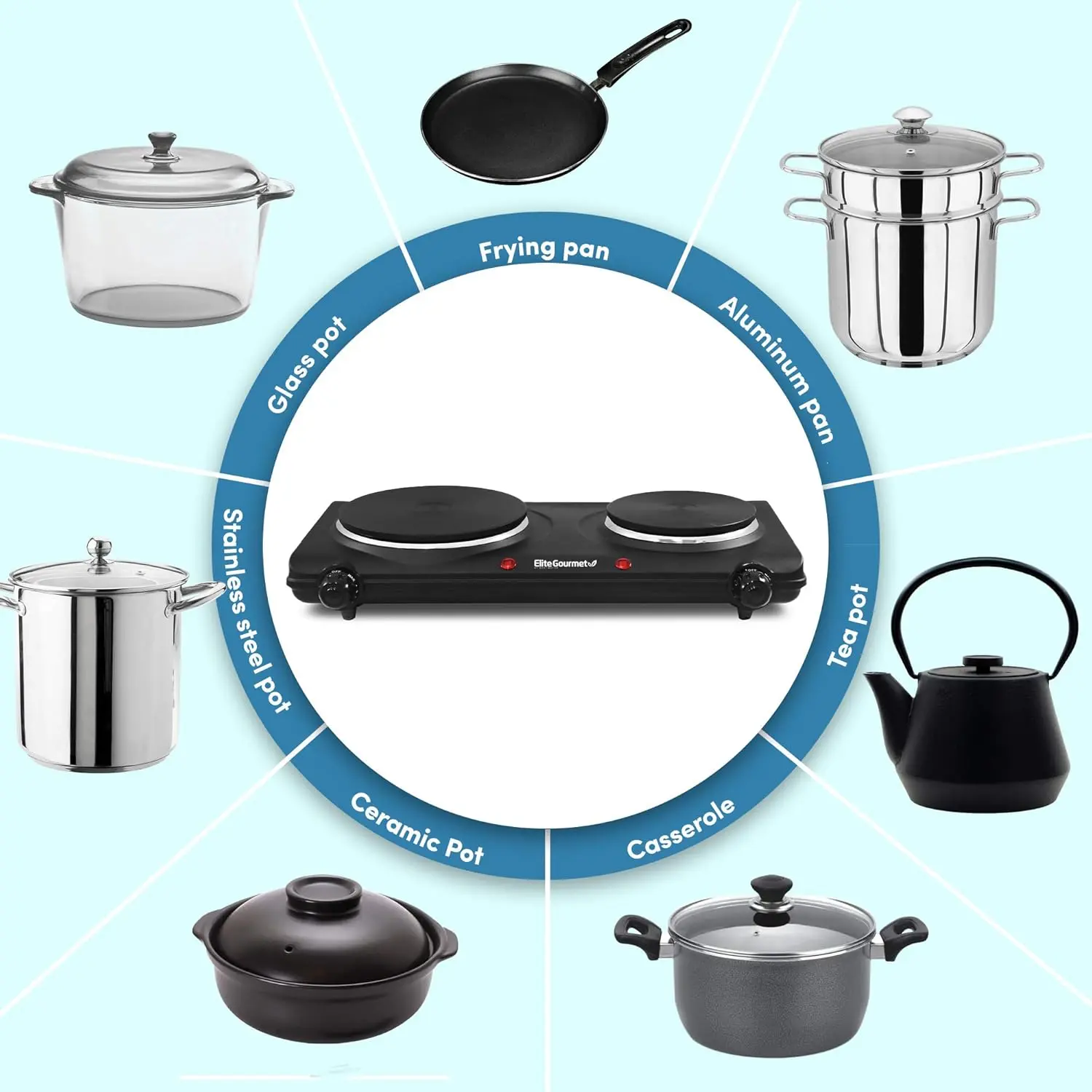 Color: Black Material: Plastic Feature: Manual Brand: Elite Gourmet Heating Elements: 2 Dimensions: 9" D x 16.5" W x 3" H Wattage: 1500 watts Controls: Knob Burner Type: Electric Included: Double Burner
