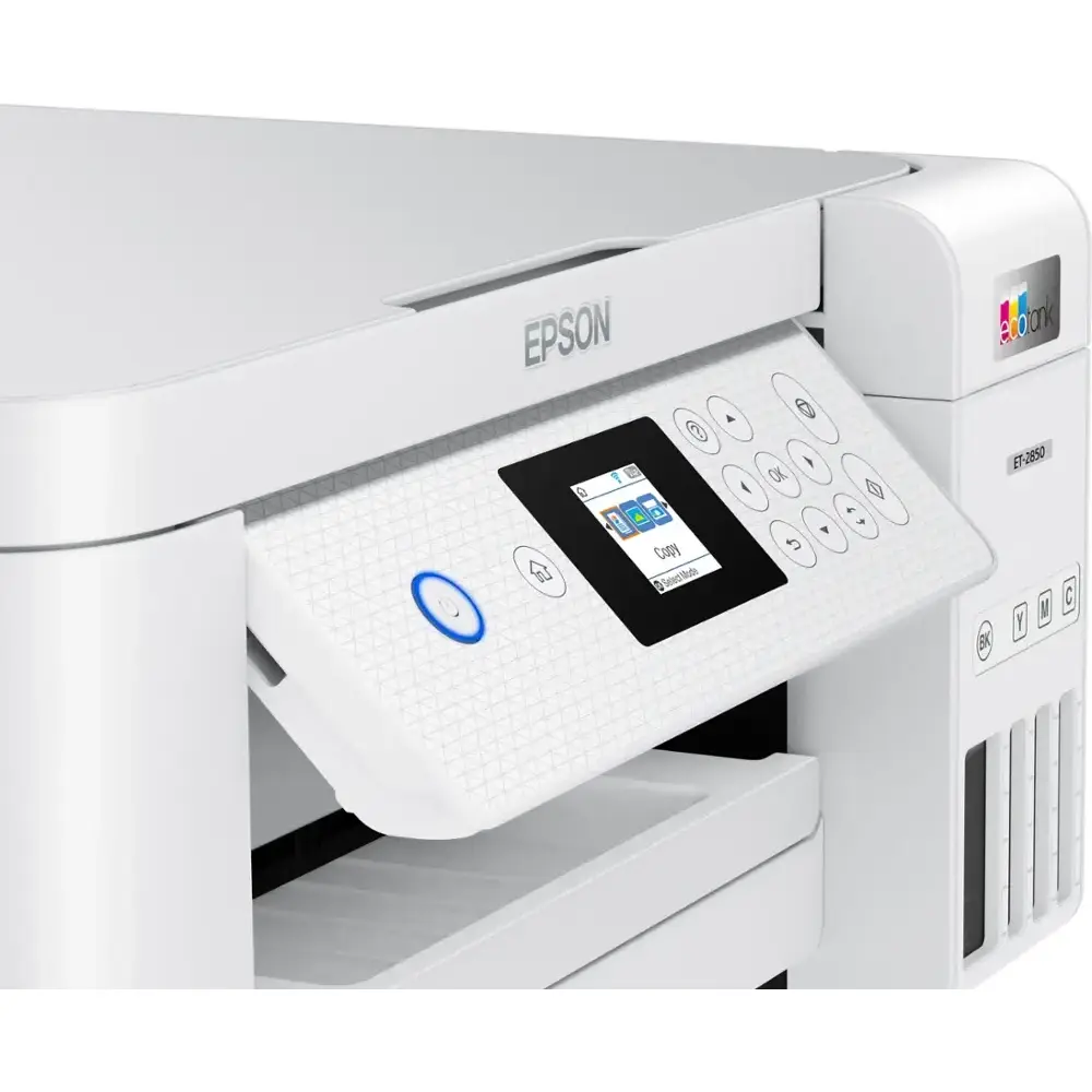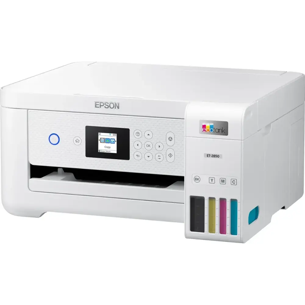 The Epson EcoTank ET-2850 is a cartridge-free, high-capacity ink tank printer designed for affordability, convenience, and efficiency. It features auto-duplex printing, a high-resolution flatbed scanner, and a color display, making it a perfect choice for home and family use. With Epson's EcoFit ink bottles, refilling is easy and worry-free, while Micro Piezo Heat-Free technology ensures sharp text and vibrant color prints on various paper types.