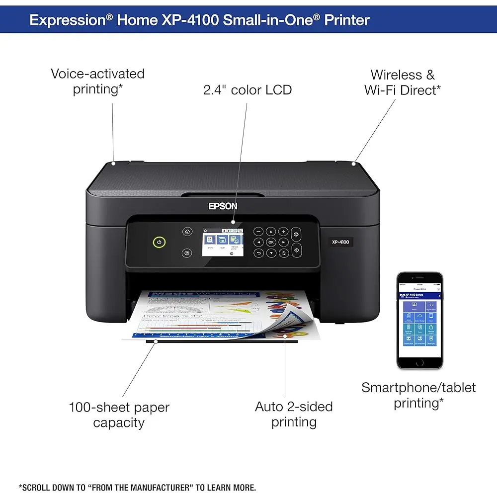 The Epson Expression XP 4100 wireless all-in-one printer offers efficient, everyday home printing with features like auto two-sided printing. Its 2.4-inch color LCD simplifies setup and navigation, allowing you to easily print, copy, and scan documents and photos. You can wirelessly print from devices such as iPads, iPhones, Android tablets, and smartphones. The printer uses affordable individual ink cartridges, so you only replace the color that runs out. It also supports hands-free, voice-activated printing for added convenience. With Instant-dry ink, your prints are touchable right away. This compact printer’s space-saving design fits easily into any home setup.