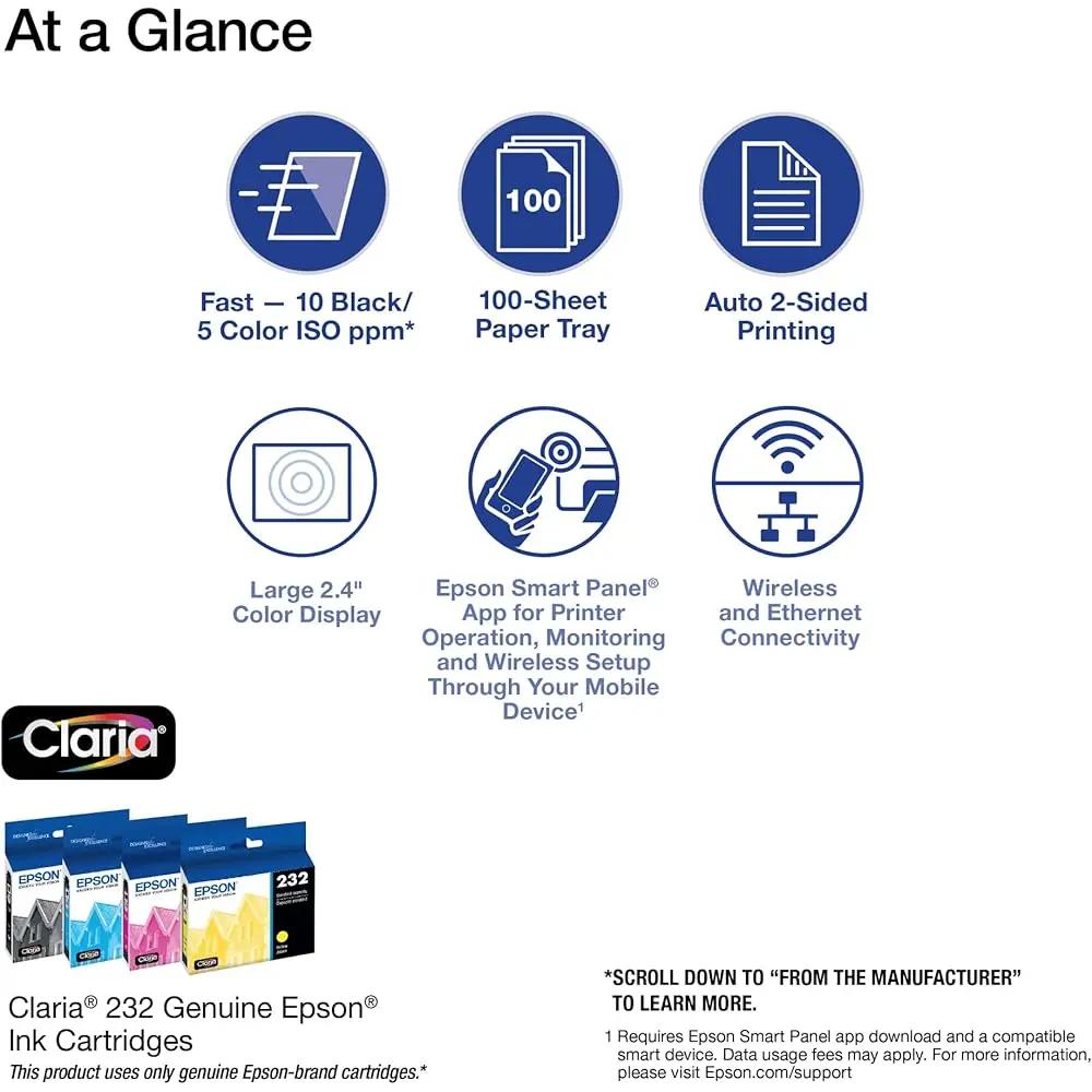 This printer is designed for use with genuine Epson cartridges only. Third-party ink supplies may not work properly or could cause damage. | 1. Requires Epson Smart Panel app; data usage fees may apply. | 2. Most features require an internet connection to the printer and compatible devices.
